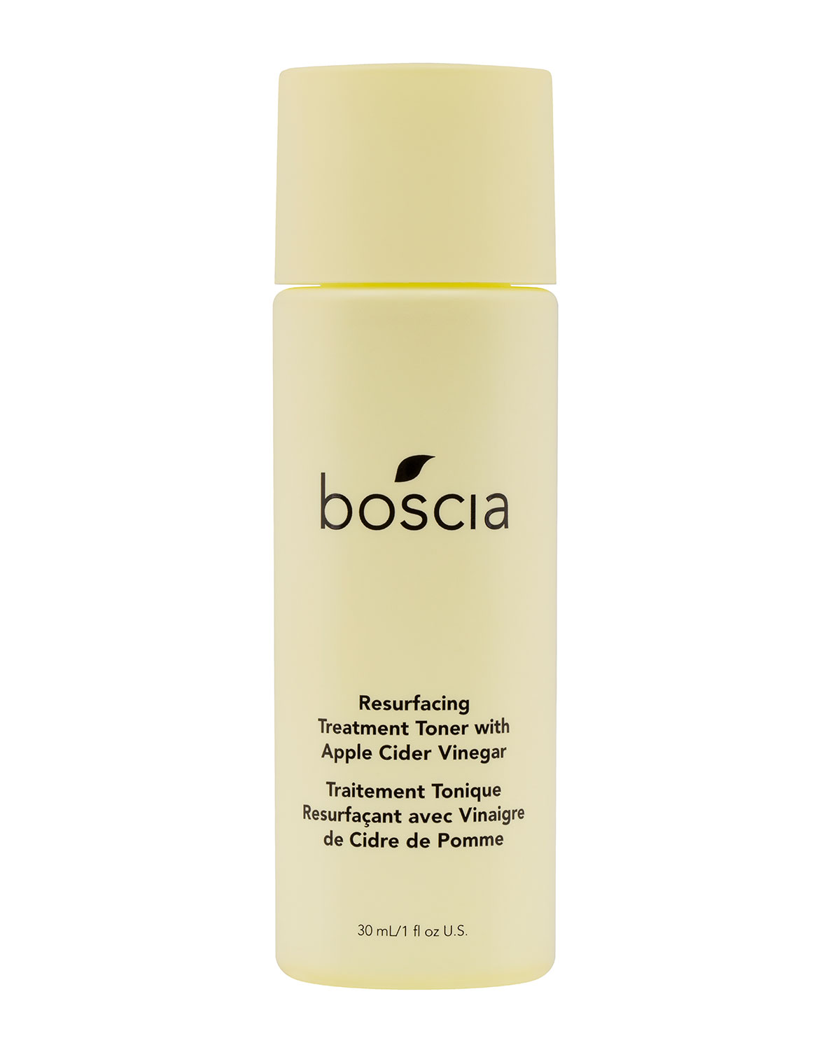 boscia 1 oz. Resurfacing Treatment Toner with Apple Cider Vinegar – Travel-Size DetailsA travel-sized resurfacing treatment toner formulated with 20% Acid Complex thoroughly resurfaces and exfoliates for invigorated and transformed-looking skin. Potent AHA’s and BHA’s provide a highly effective revitalization to slough off dead skin cells and minimize the appearance of pores while reawakening the look of dull skin. A boost of Apple Cider Vinegar helps tone skin and softens the look of wrinkle.