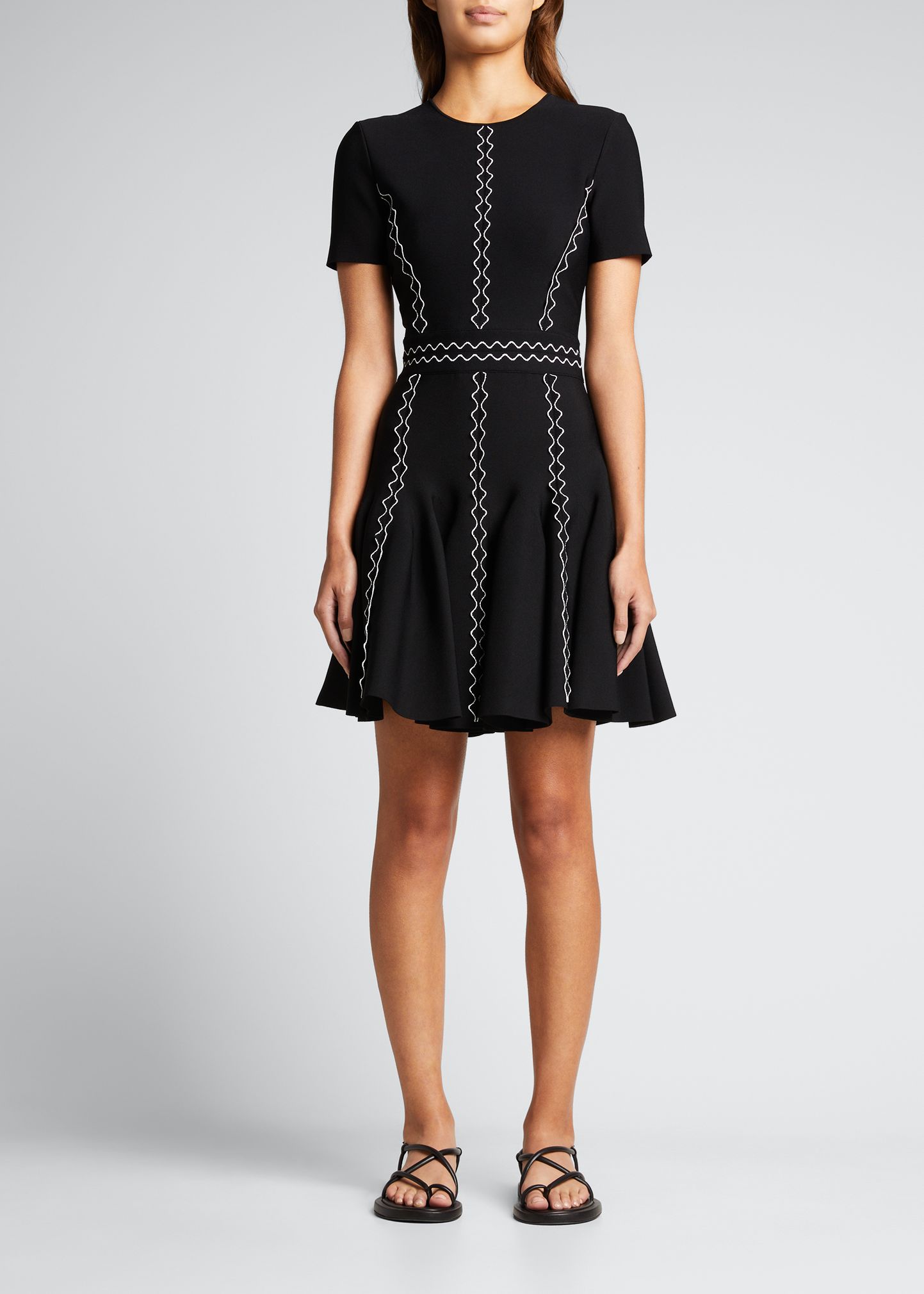 Alexander McQueen dress with bicolor stitched 3-D scallop trim Crew neckline; button/keyhole back Short sleeves Banded waist Fit-and-flare silhouette Above knee length Viscose/polyamide/polyester Made in Italy