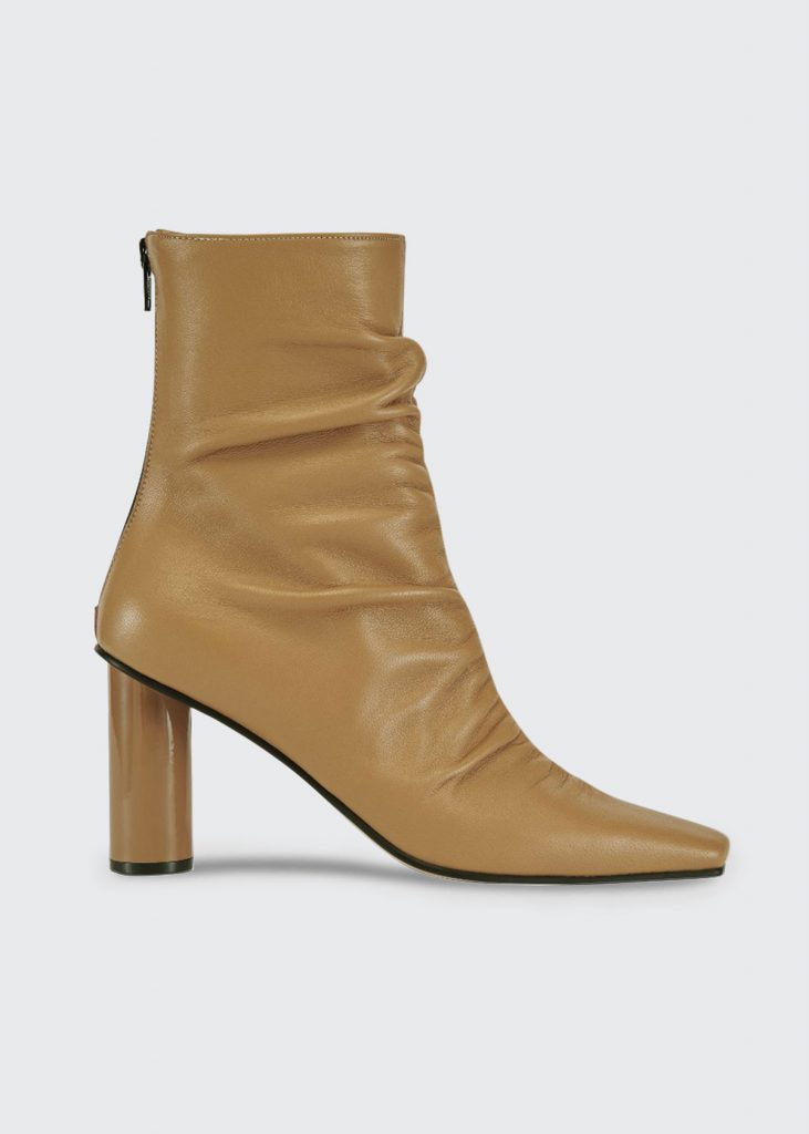Reike Nen 80mm wrinkle leather booties. 3.1″ cylinder heel. Square toe. Back zip eases dress. Smooth sole. Imported.