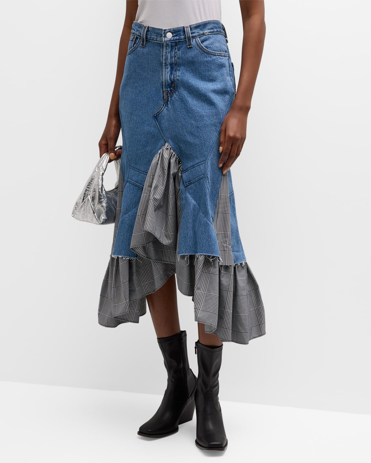 Rentrayage “Abilene” one-of-a-kind combo midi skirt featuring a denim bodice and plaid ruffle hem Five-pocket style High rise A-line silhouette High-low hem Button/zip fly; belt loops Cotton Dry clean Made in USA