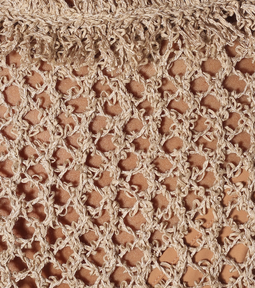 ALANUI creates a wearable work of art with its Dune minidress, knitted in a semi-sheer net finish that makes it a perfect poolside cover-up or lightweight layering piece. The beige design takes six hours to knit and assemble, and it’s crafted from cotton mixed with paper fibers and Japanese silk ?????? a fluid yarn inspired by the translucent surface of water.