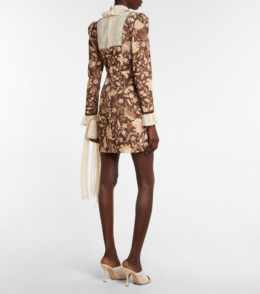 The Lucianna minidress from Alemais radiates vintage appeal with its lace-trimmed flared cuffs and ruffled high neckline. It??????s made from panels of cotton corduroy with an ornamental floral print, fitted bodice, and lightly puffed shoulders.