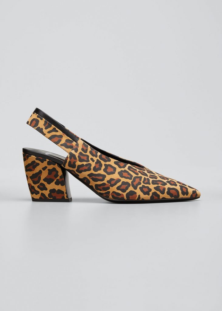 Pierre Hardy 70mm “Alpha” leopard-print suede pumps with leather trim. 2.8″ covered block heel. Pointed toe. Slingback strap with elastic insert. Slip-on style. Lamb Leather lining. Smooth sole. Made in Italy.
