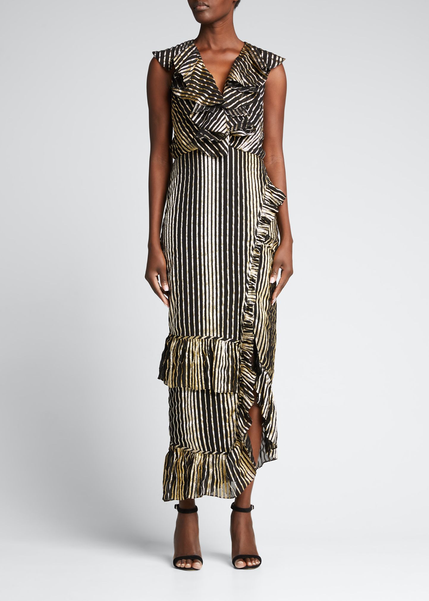 Saloni “Anita” cocktail dress in floral jacquard with metallic detail. V neckline. Sleeveless. A-line silhouette. High-low flounce hem. Midi length. Back zipper. Rayon/silk/metallic. Imported.