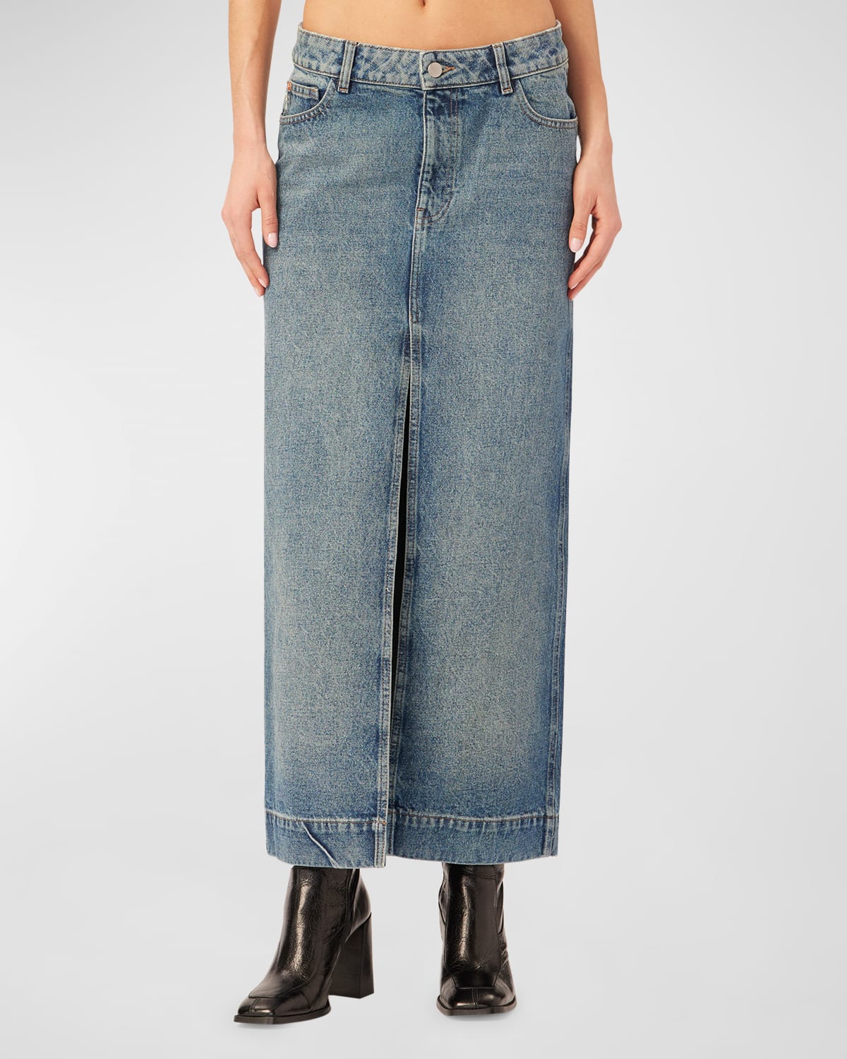 DL1961 Premium Denim “Asra” faded denim maxi skirt featuring a center front slit Five-pocket style Low-rise Skirt falls straight from hip to hem Full elngth Button/zip fly; belt loops Cotton Machine wash cold Imported