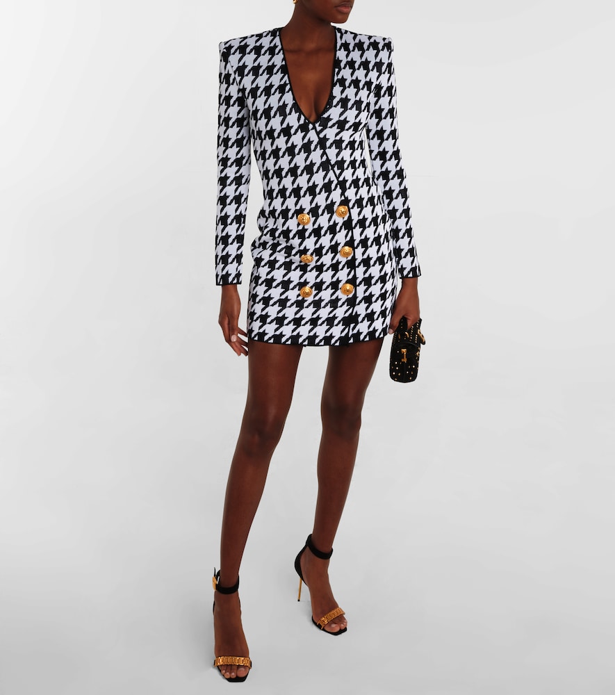 This Balmain minidress is made from a weighty, compact jacquard that hugs the body’s natural curves. It comes in a houndstooth-checked pattern and has strongly padded shoulders.