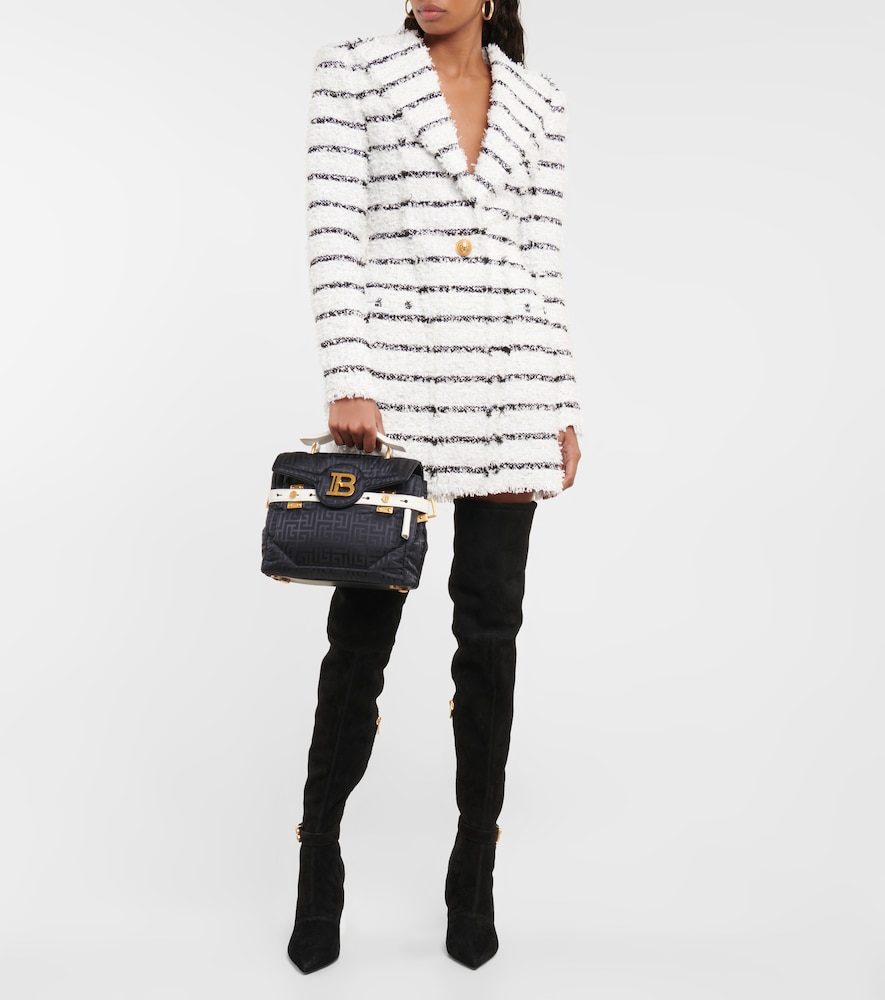 For a subversive take on the minidress, choose this blazer style from Balmain. It??????s made from a striped, textured tweed interwoven with metallic threads and features signature gold-toned buttons at the cuffs and single-breasted closure.