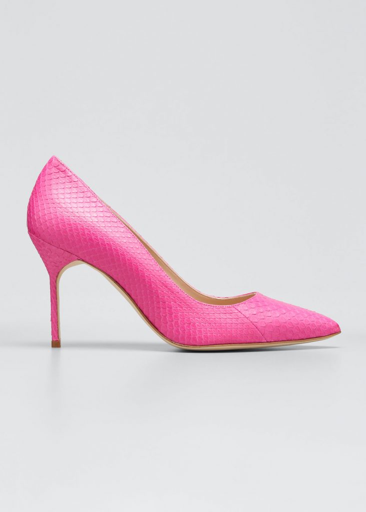 Manolo Blahnik elaphe snakeskin pump. 3.5″ stiletto heel. Pointed toe. Topstitched collar. Leather lining. Slip-on style. “BB” is made in Italy.