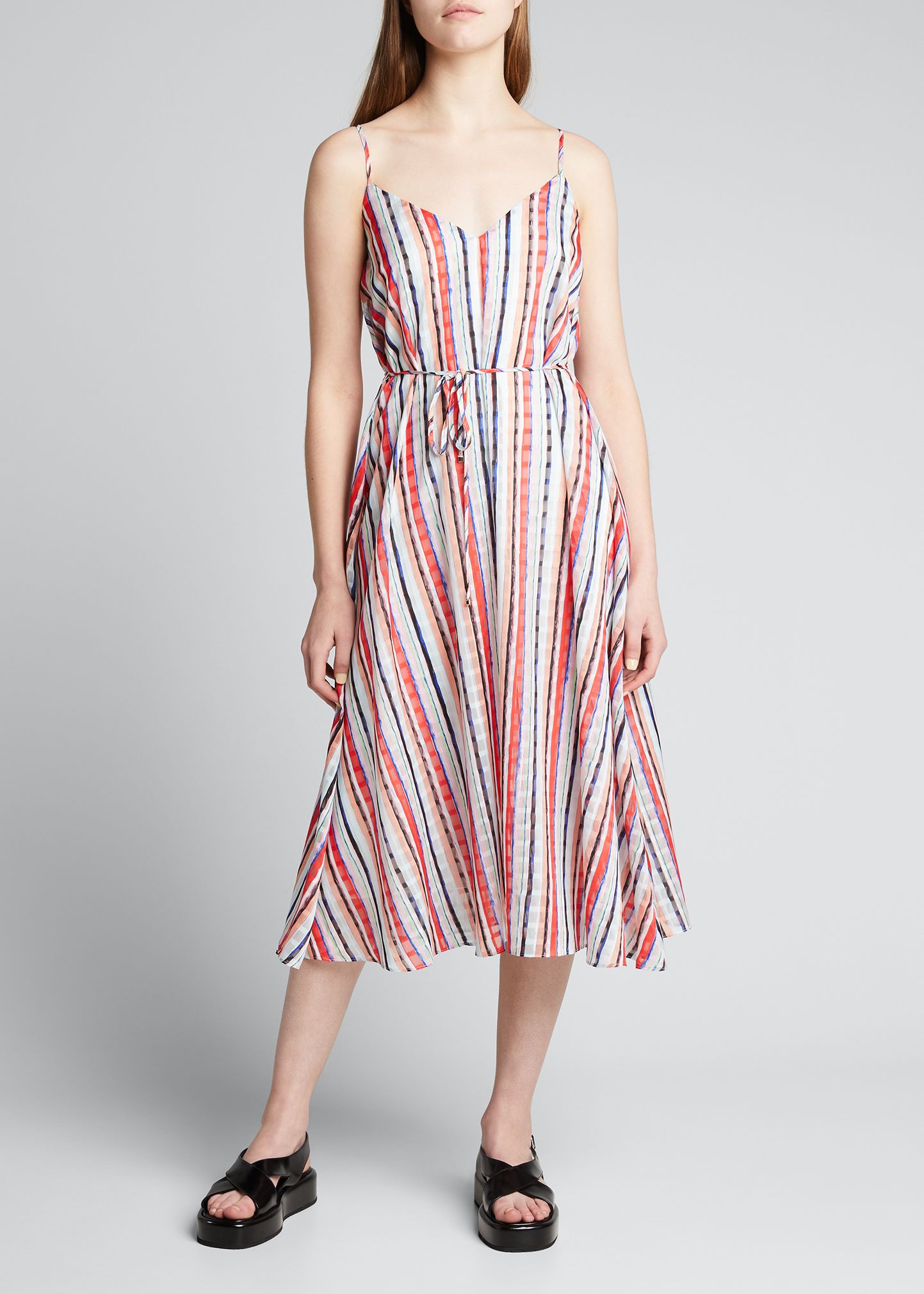 Milly “Becca” light and airy dress with spaghetti-straps and removable self-belt. Approx. 38″L from shoulder to hem. V neckline. Sleeveless. A-line silhouette. Hem sits below the knee. Polyester, self/lining. Dry clean. Imported.