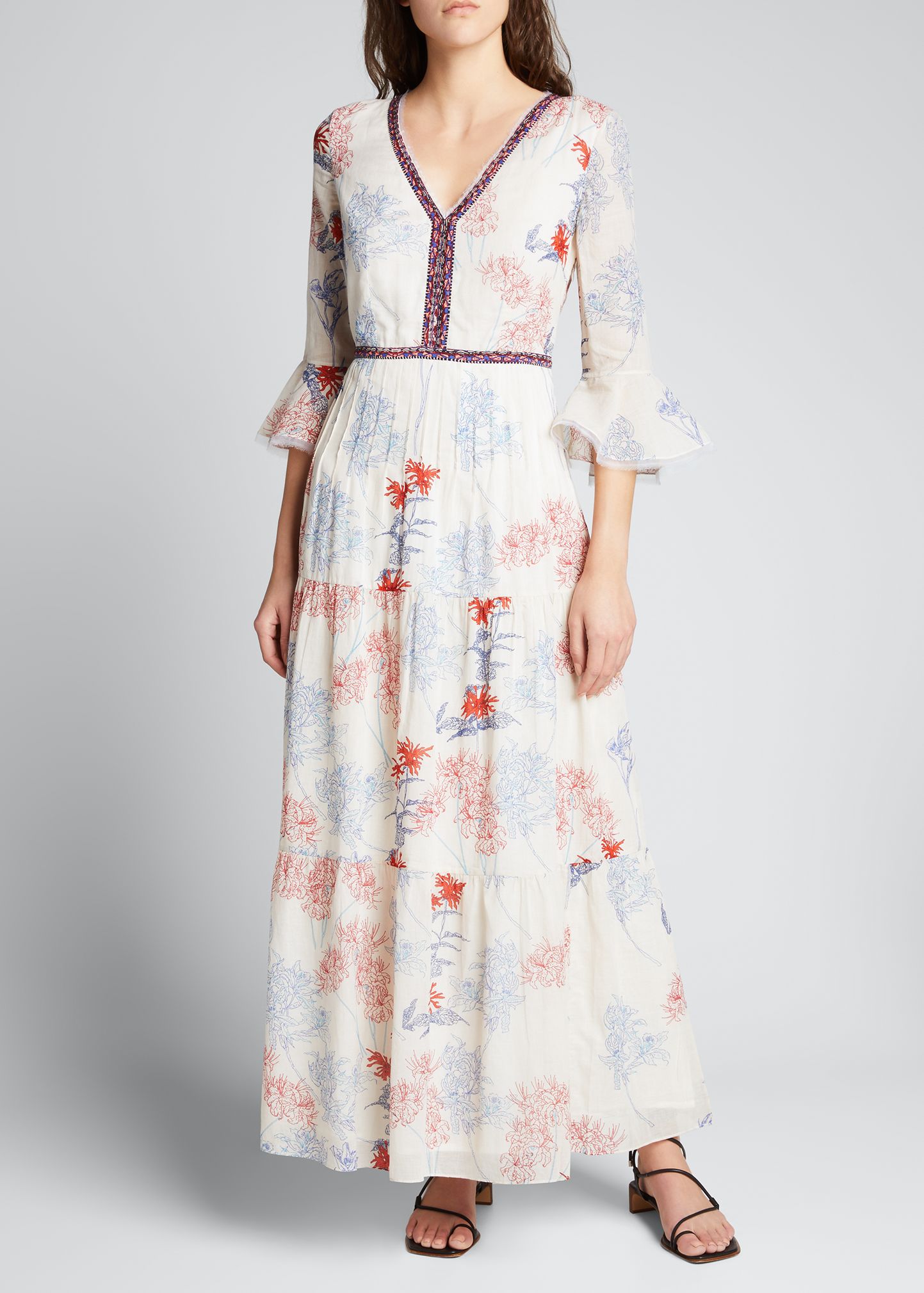 Le Sirenuse “Bella Spring Flowers” printed dress with tiered skirt and ruffle cuffs. V neckline. Three-quarter sleeves; ruffle cuffs. Contrast bodice trim. A-line silhouette. Maxi length. Cotton. Imported.