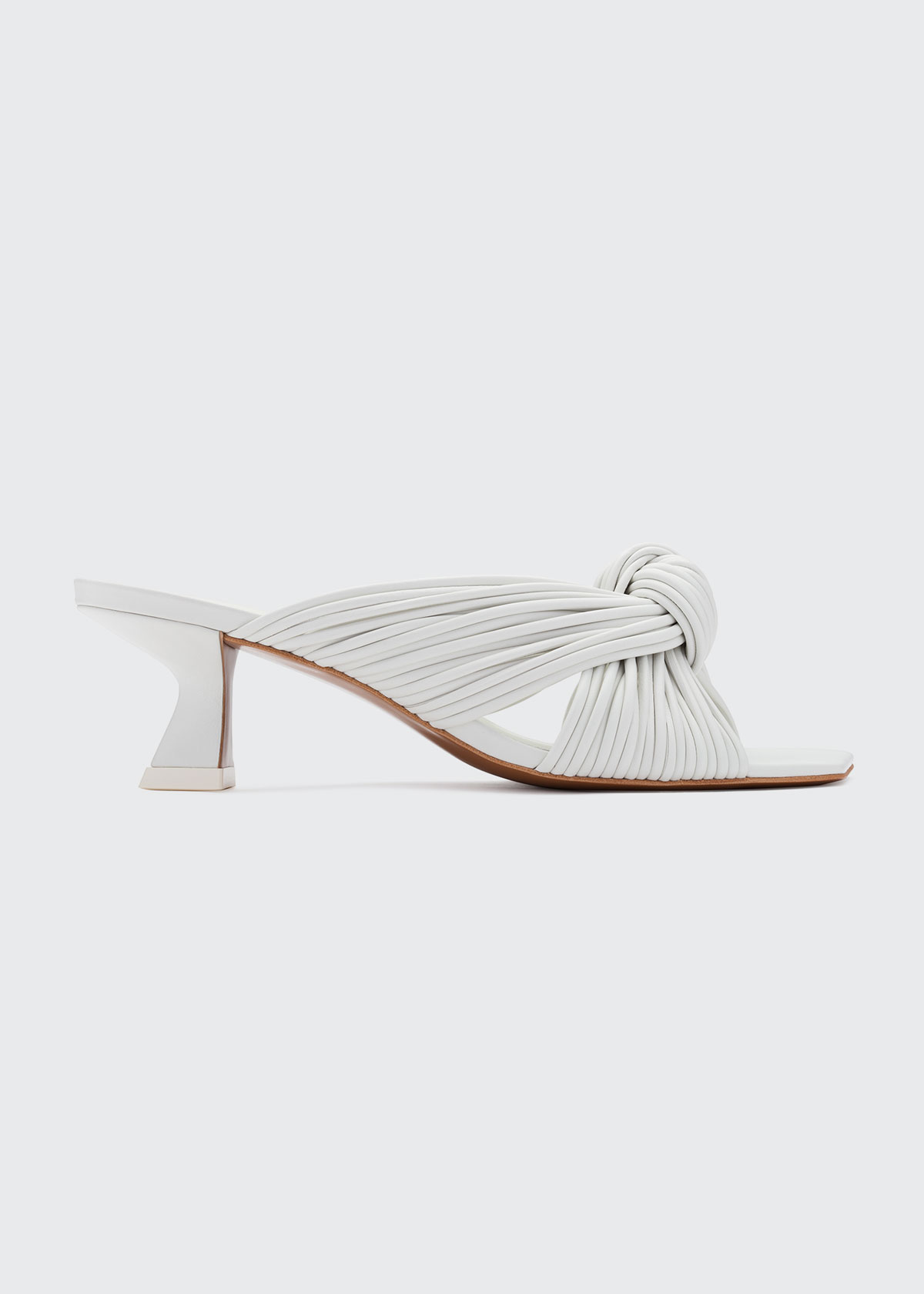 Mercedes Castillo 65mm “Bianca” calfskin leather sandals. 2.5″ chubby kitten heel. Open square toe. Strappy knotted upper. Slide style. Smooth sole. Made in Brazil.