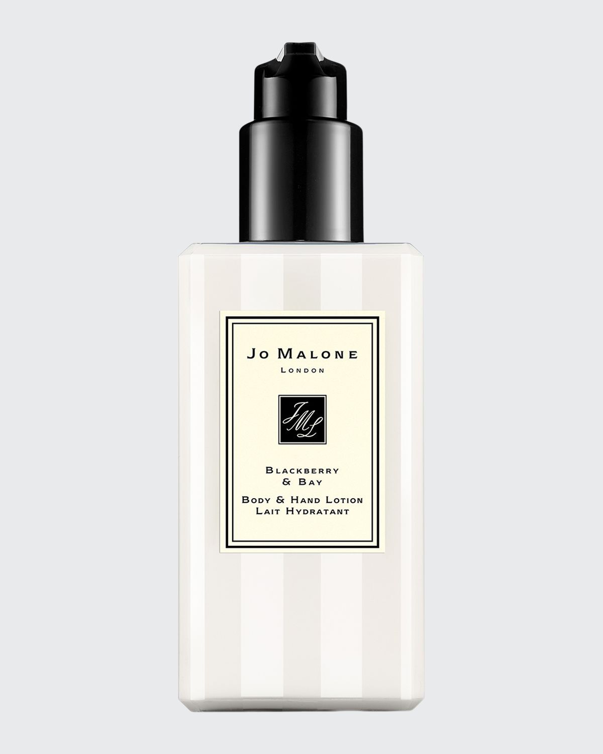 Jo Malone London Blackberry and Bay Body Lotion, 250 mL Childhood memories of blackberry picking.A burst of deep, tart blackberry juice, blending with the freshness of just-gathered bay and brambly woods. Vibrant and verdant. Enriched with coconut oil, our Body & Hand Lotion is readily absorbed to instantly hydrate and condition, while its fragrance-diffusing properties help to radiate scent from the skin. 250 mL/ 8.5 fl. oz.