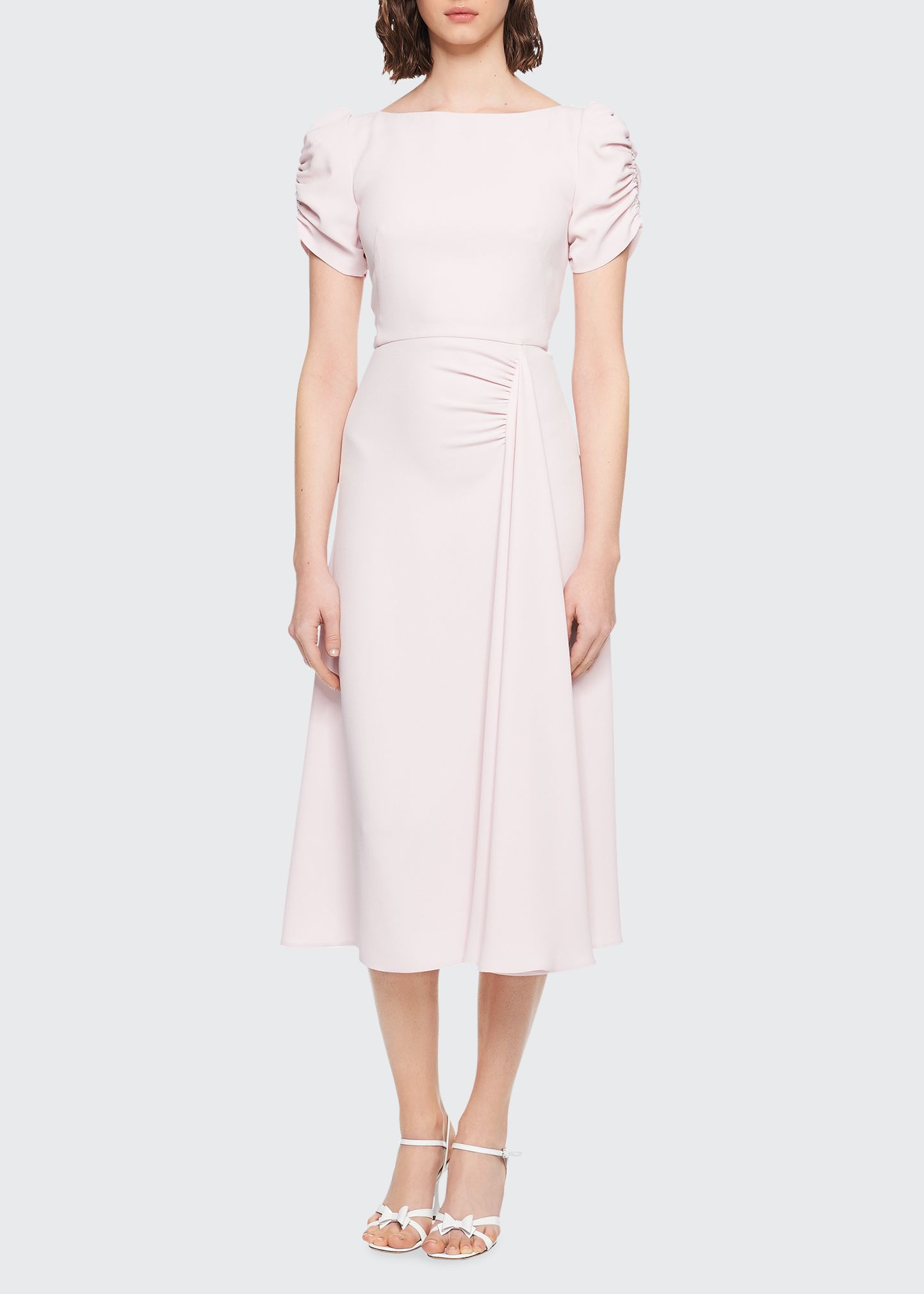 Miu Miu sable dress with cinched detail Boat neckline Short puff sleeves A-line silhouette Midi length Back zip Nylon/acetate/polyester Polyester lining Made in Italy