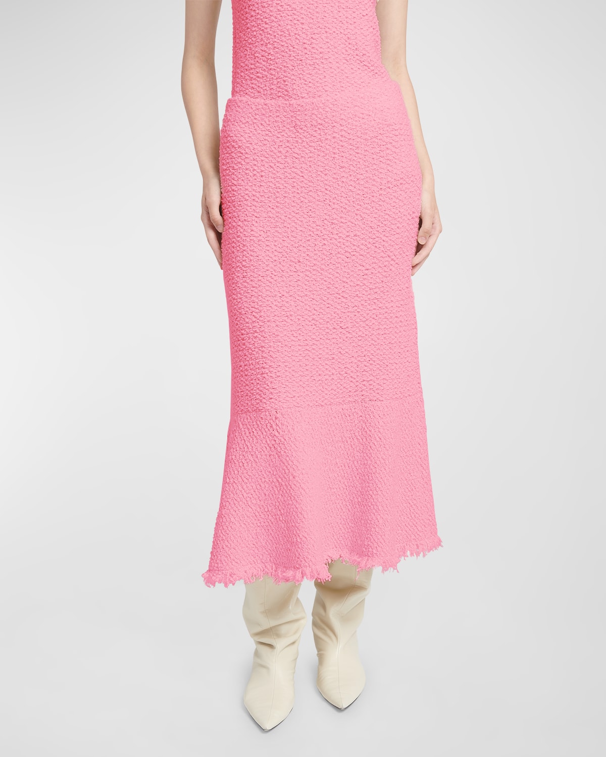 Jil Sander boucle knit skirt featuring raw-edged hem Mid waist Hem falls below the knee Fit-and-flare silhouette Invisible side zip Cotton/Proviscose® rayon/elastane Made in Italy