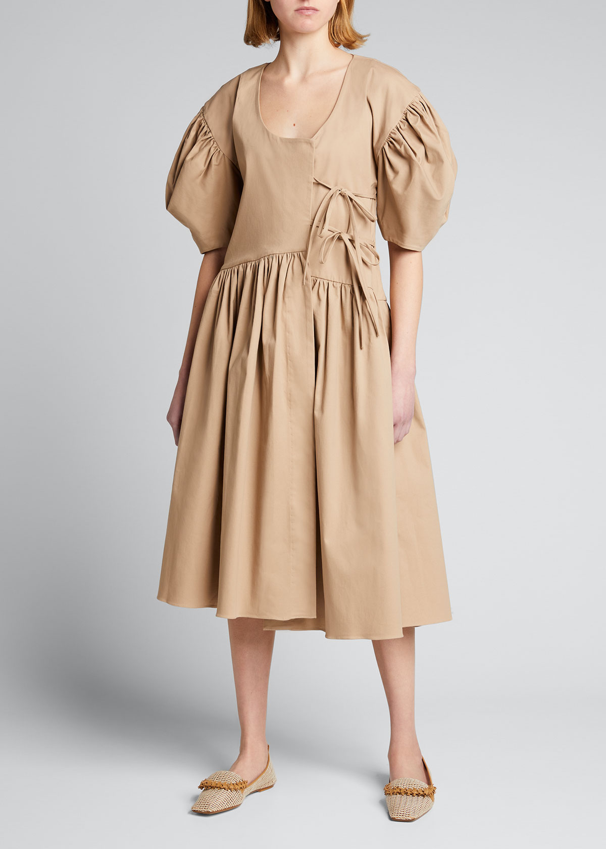 Kika Vargas “Carmen” cotton twill wrap dress. Approx. 47.2″L from shoulder to hem. Oversized look, true to size. Scoop neckline; front hook-eye and self-tie fastenings. Elbow length puff sleeves. Gathered asymmetric waist. Full, pleated skirt. Hip pockets. Midi length. Cotton. Made in Colombia.
