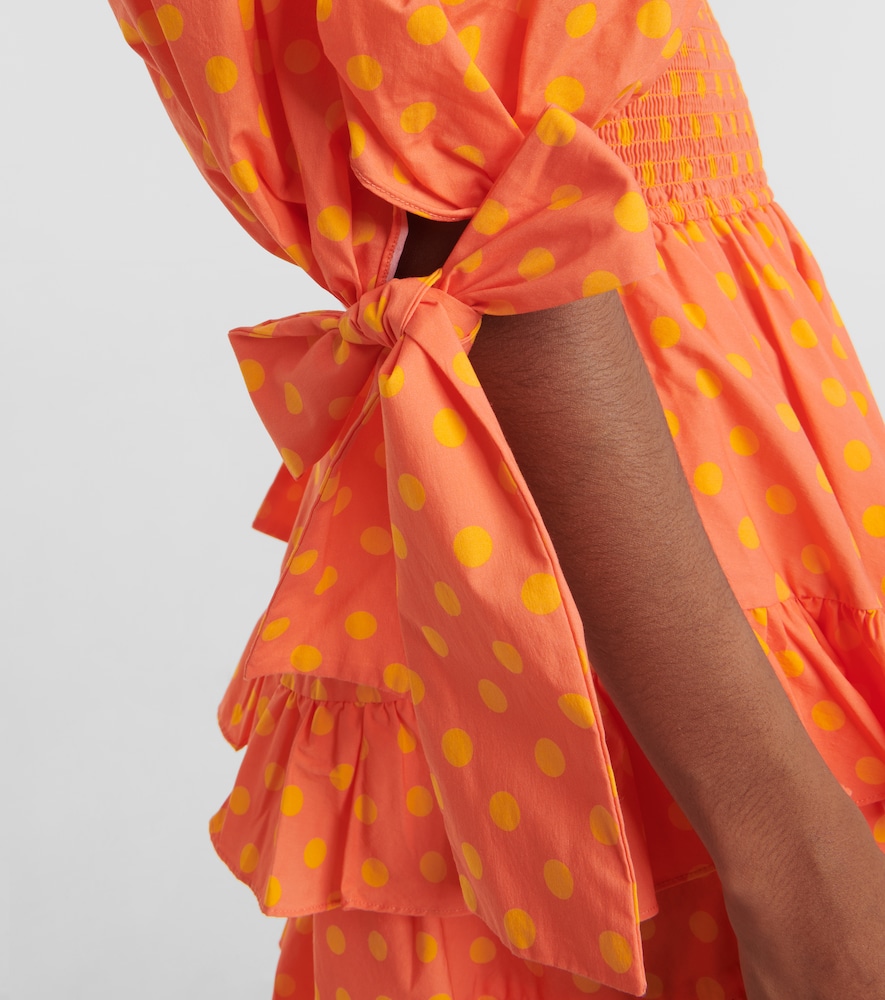 The Finley minidress from Caroline Constas has a flattering shirred bodice framed by puffed sleeves. It’s made from a polka-dot cotton-blend with a tiered skirt.
