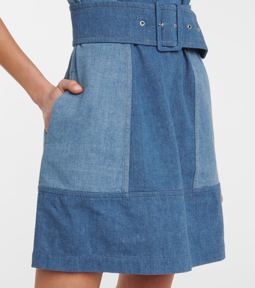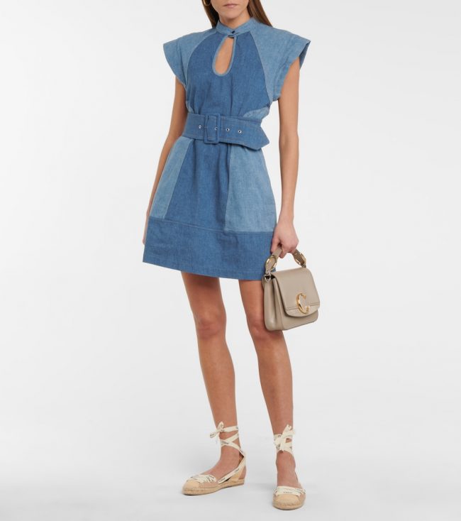 Constructed from denim panels in contrasting shades of blue, this minidress from Chloe exudes retro charm. The fitted silhouette is belted at the waist, and shaped with oversized cap sleeves, a keyhole cutout and an A-line skirt. Style with ankle-tie espadrilles to complete the look.