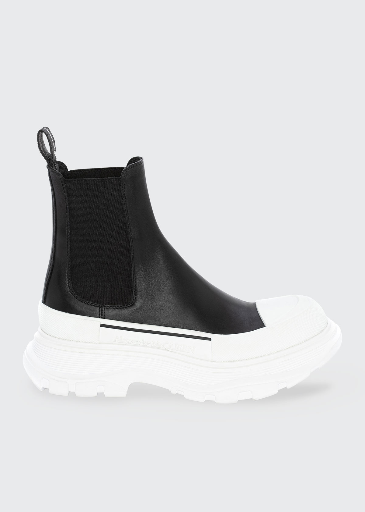 Alexander McQueen shiny leather ankle booties. Chunky contrast heel. Round cap toe. Gored sides for easy pull-on. Pull-tab at back collar. Lugged rubber sole. Made in Italy.