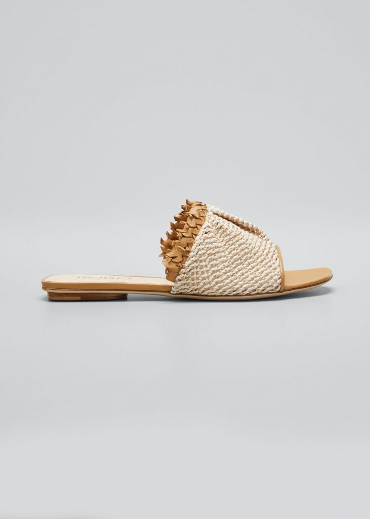 RODO “Classico” woven fabric sandals with leather shag trim. Flat heel. Open toe. Wide band upper. Slide style. Bovine leather sole. Made in Italy.