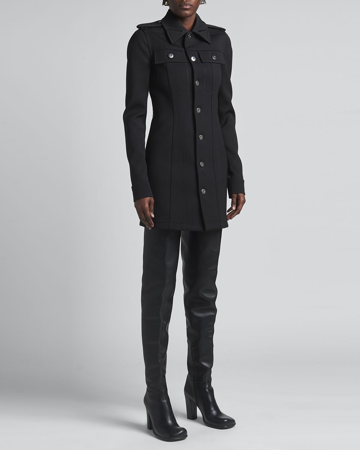 Bottega Veneta bonded stretch cavalry wool dress with detachable metal plates Point collar; button front Long sleeves; button cuffs Shoulder epaulettes Chest flap button pockets Sheath silhouette Mini length Wool/polyamide/elastane Made in Italy