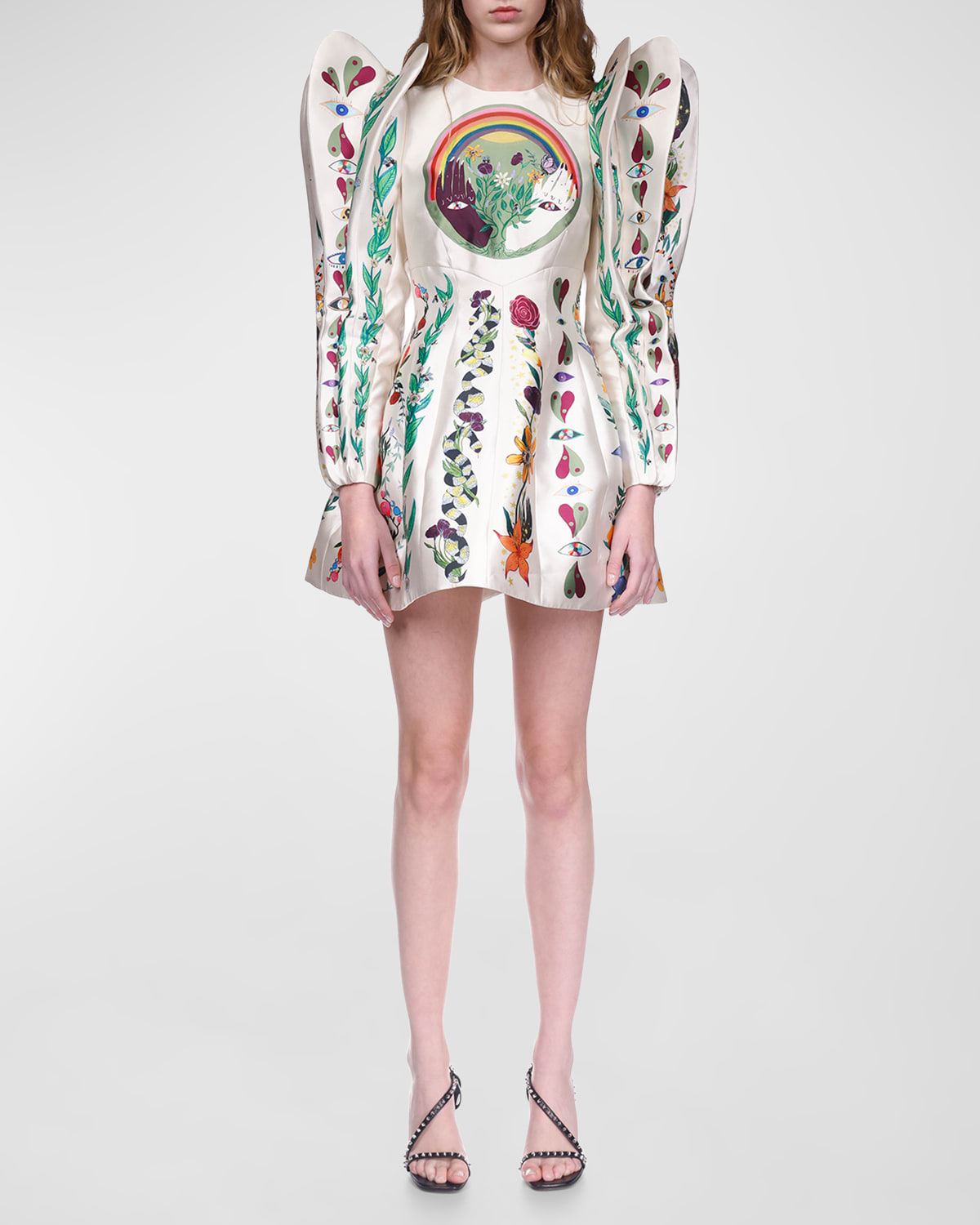 ALEMAIS “Cosmic” dress features exaggerated petal sleeves and hand-painted mystic floral motifs Approx. 34.3″L from shoulder to hem Artwork in collaboration with artist Meagan Boyd Jewel neckline Long sleeves Vertical paneling through skirt Mini length Fit & flare silhouette Invisible back zipper Polyester Imported