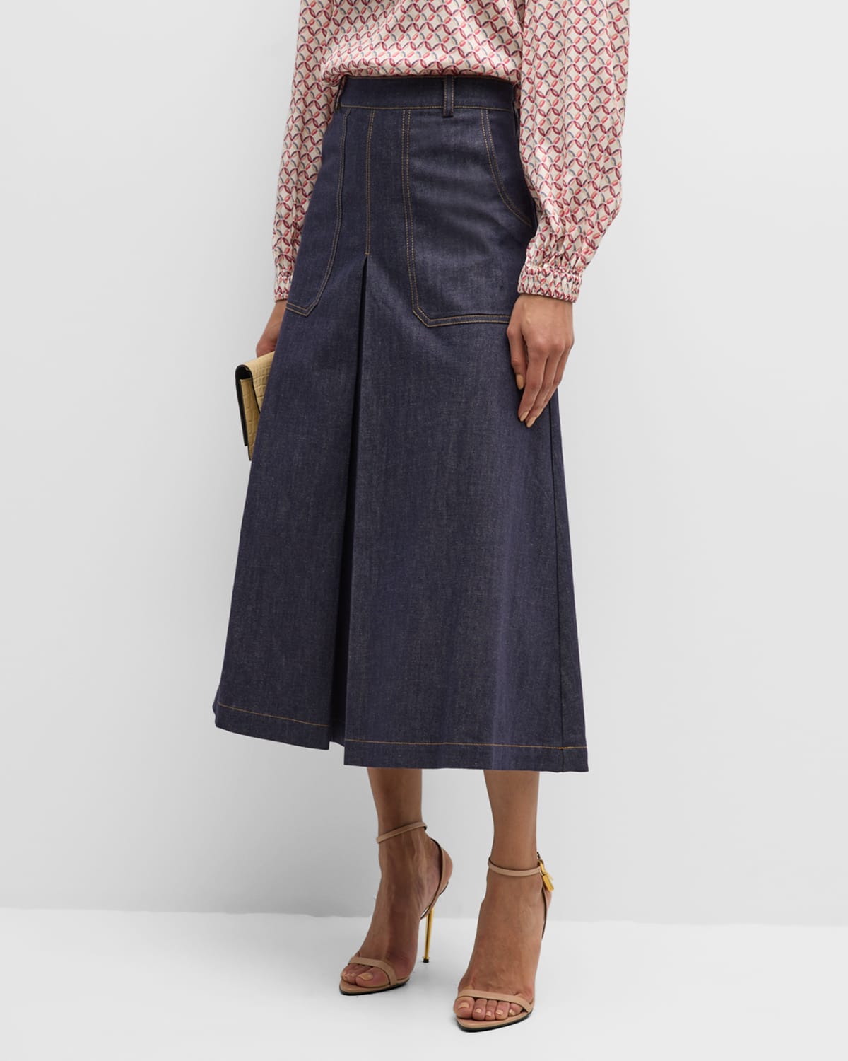Dea Kudibal “Dinessa” denim midi skirt with contrast topstitching and inverted pleats Sits high on the hips Flat front Side slant pockets Back patch pockets Hem falls below the knee A-line silhouette Zip closure Cotton/elastane Machine wash cold Imported