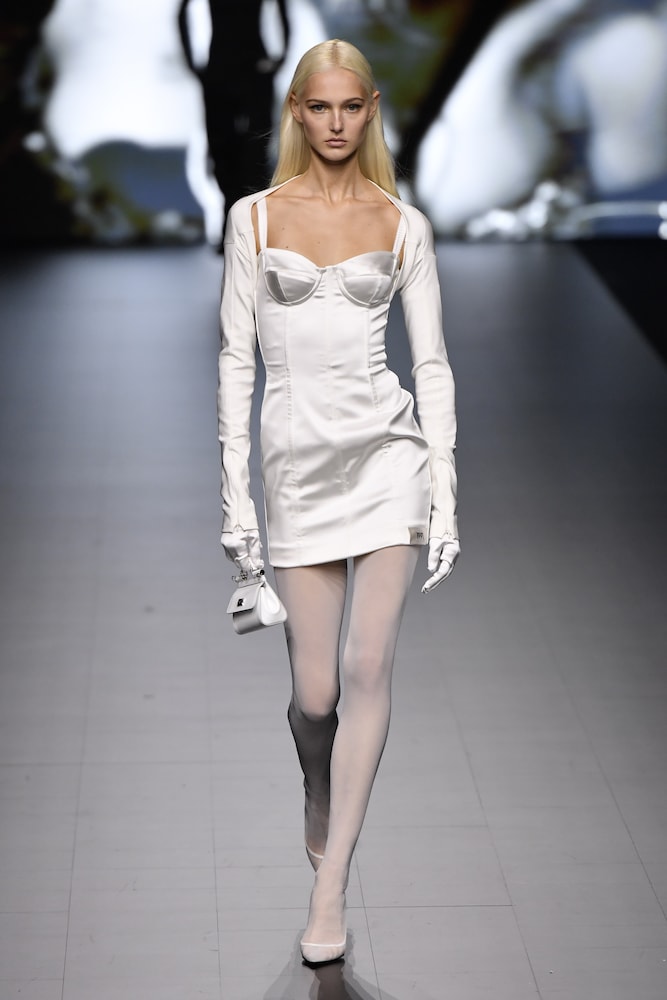 Kim Kardashian collaborates with Dolce&Gabbana for a timeless collection reminiscent of the brand??????s origins in Italian femininity. This alluring minidress is made from stretchy satin and features a corset bodice.