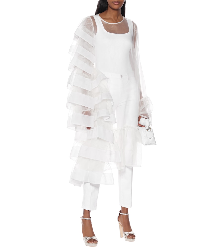 A cascade of ruffles ripples down one side of this minidress from Dries Van Noten ?????? a key motif from the designer’s collaboration with Christian Lacroix. The piece is made from white silk organza that’s so sheer it’s barely there, and trimmed with textured netting that displays Lacroix??????s talent for abundance.