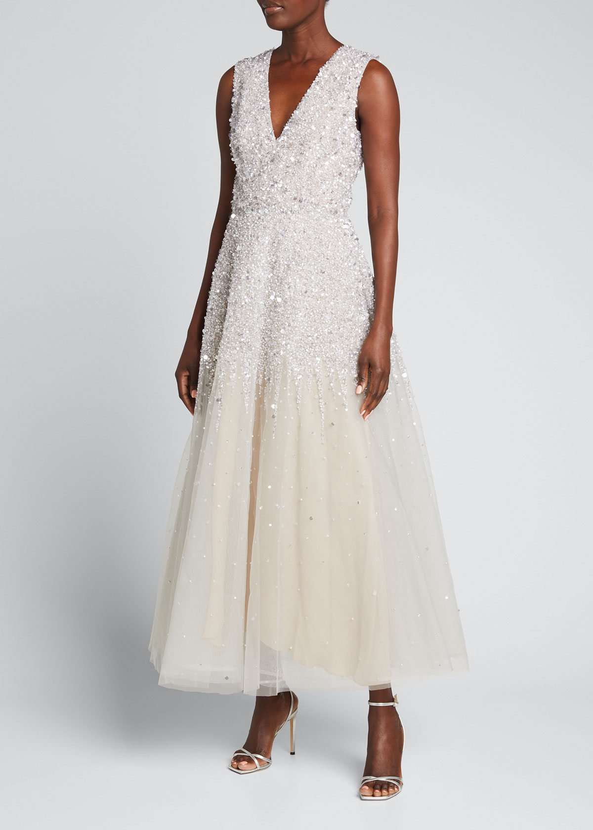 Reem Acra embellished tulle dress. V neckline. Sleeveless. A-line silhouette. Tea length. Back zip. Nylon. Made in USA.