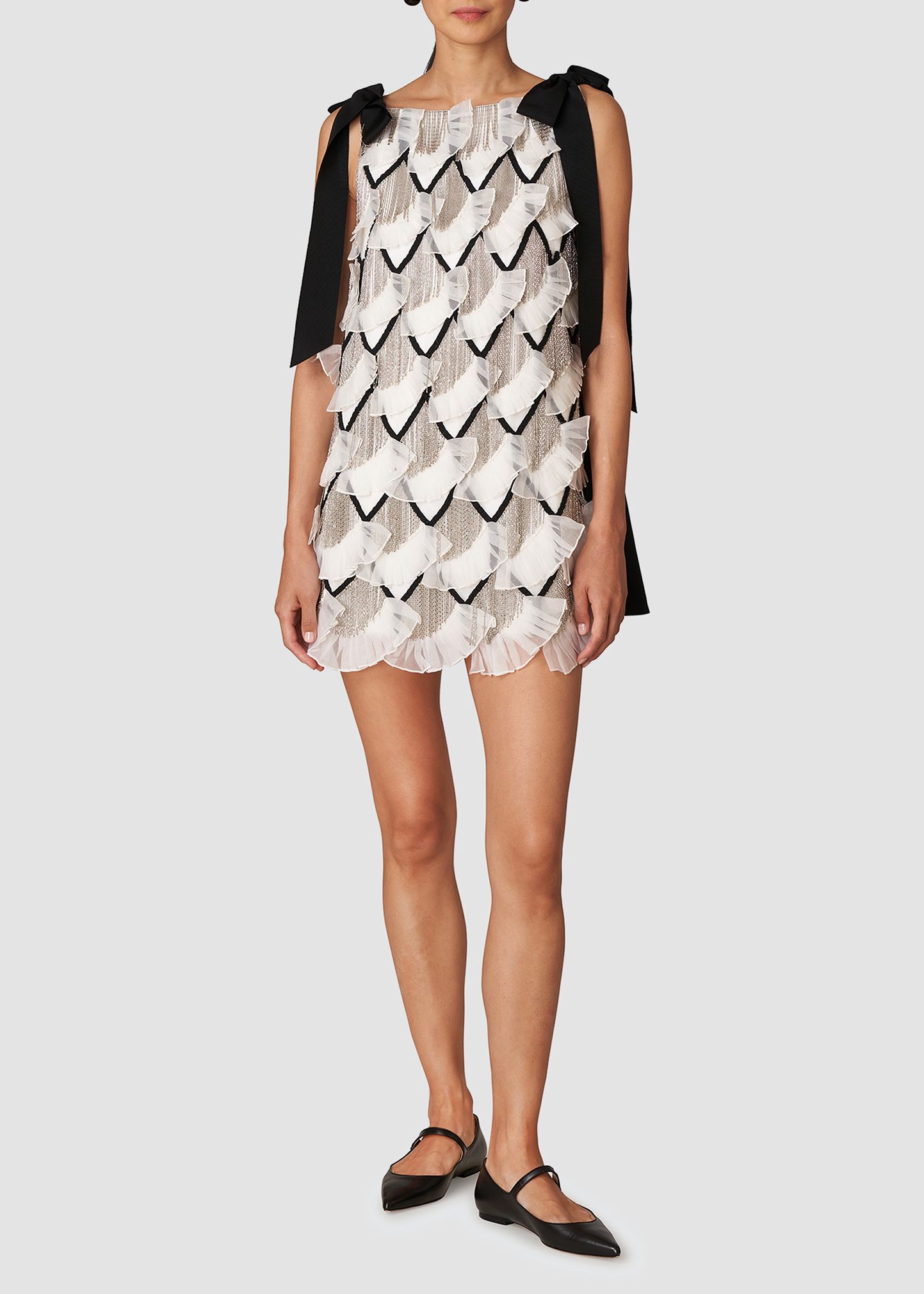 Carolina Herrera silk dress in with ruffle detail. Boat neckline. Bow-tie shoulder straps. Shift silhouette. Mini length. Scallop hem. Silk. Polyester/spandex, lining. Made in USA.