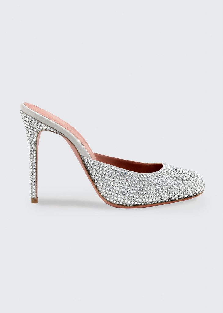 Amina Muaddi crystal studded satin mule sandals. 3.8″ stiletto heel. Round toe. Slide style. Leather lining and sole. “Emili” is made in Imported.