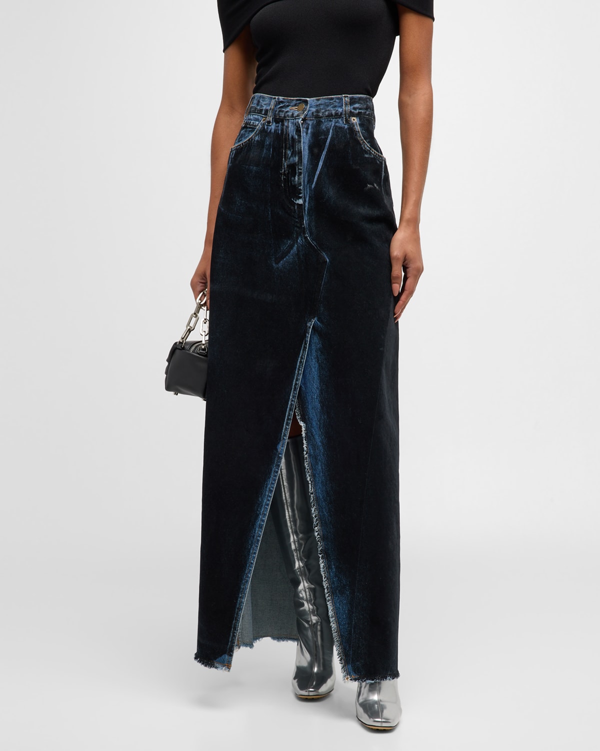 DARKPARK “Emma” dyed denim maxi skirt with fading Five-pocket style High rise A-line silhouette Center front slit; frayed hem Button/zip fly; belt loops Cotton Lining: Cotton/polyester Hand wash Made in Italy