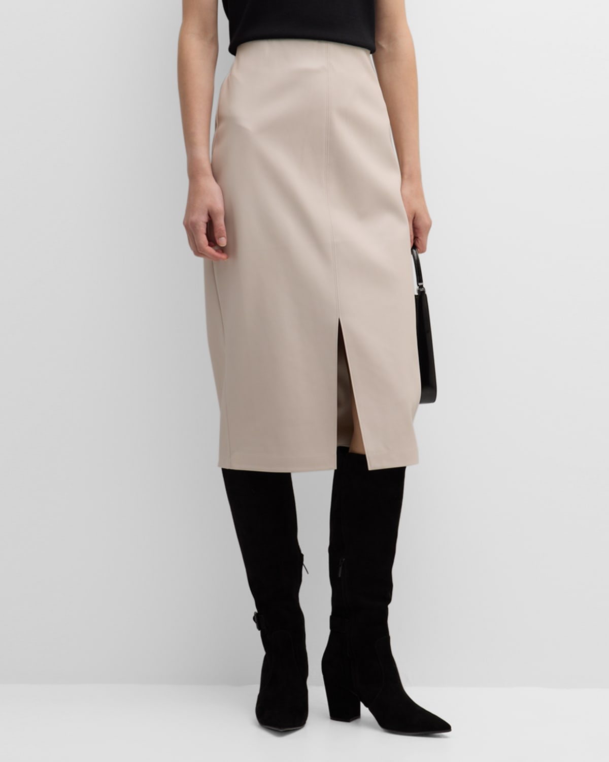 Brochu Walker “Esme” midi skirt features a front topstitched seam Approx. 29.5″L from waistband to hem Sits high on the hips Elasticized waistband Front slit hem Hem falls below the knee Pencil silhouette Invisible side zipper Polyester Unlined Dry clean Imported
