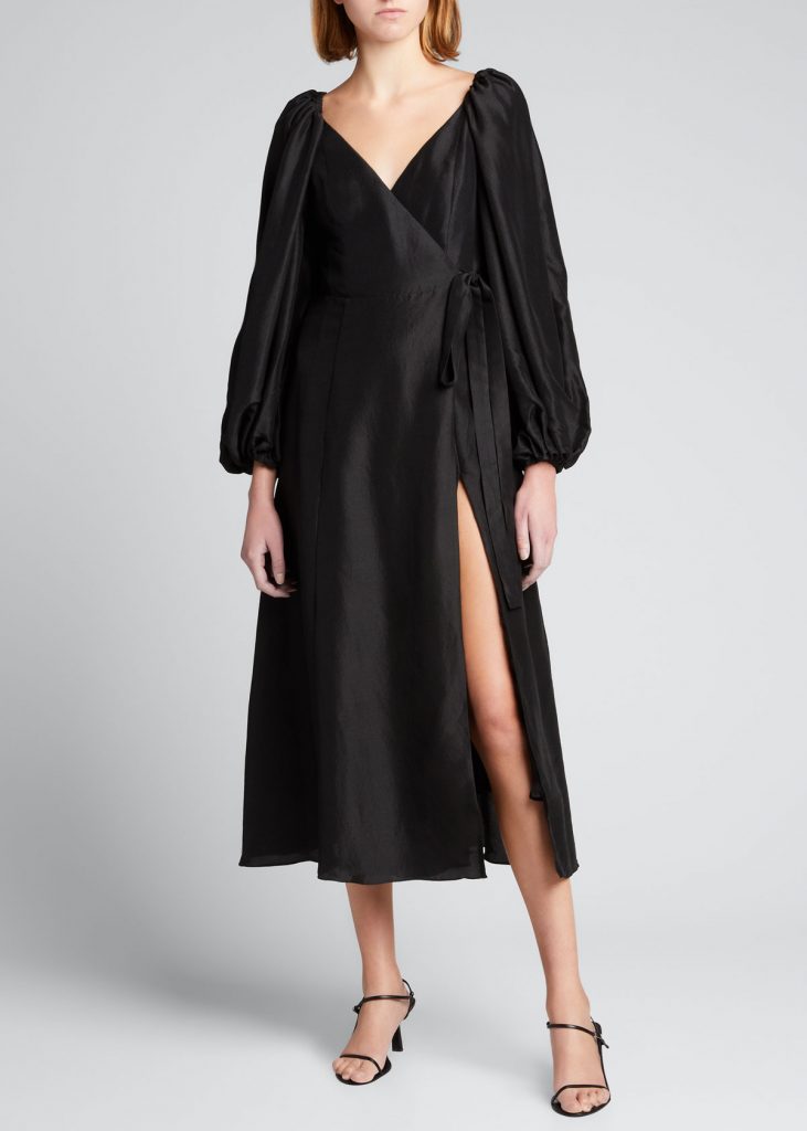 Azeeza “Evette” wrap dress. Approx. 49″L from shoulder to hem. Surplice neckline. Long blouson sleeves. A-line silhouette. Thigh-high slit. Self-tie wrap closure. Hem falls below the knee. Silk. Made in USA.