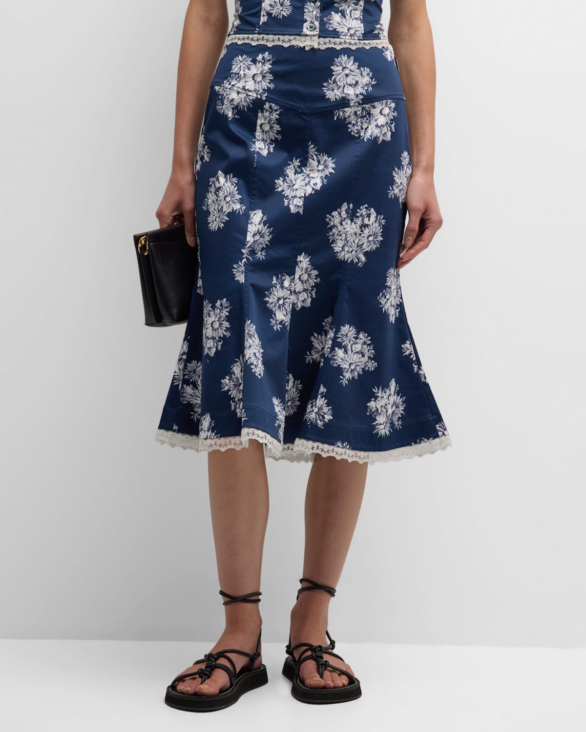 Jason Wu floral-print midi skirt with scalloped lace hem Hem falls below the knee Flared silhouette Invisible side zipper Cotton/spandex Dry clean Imported