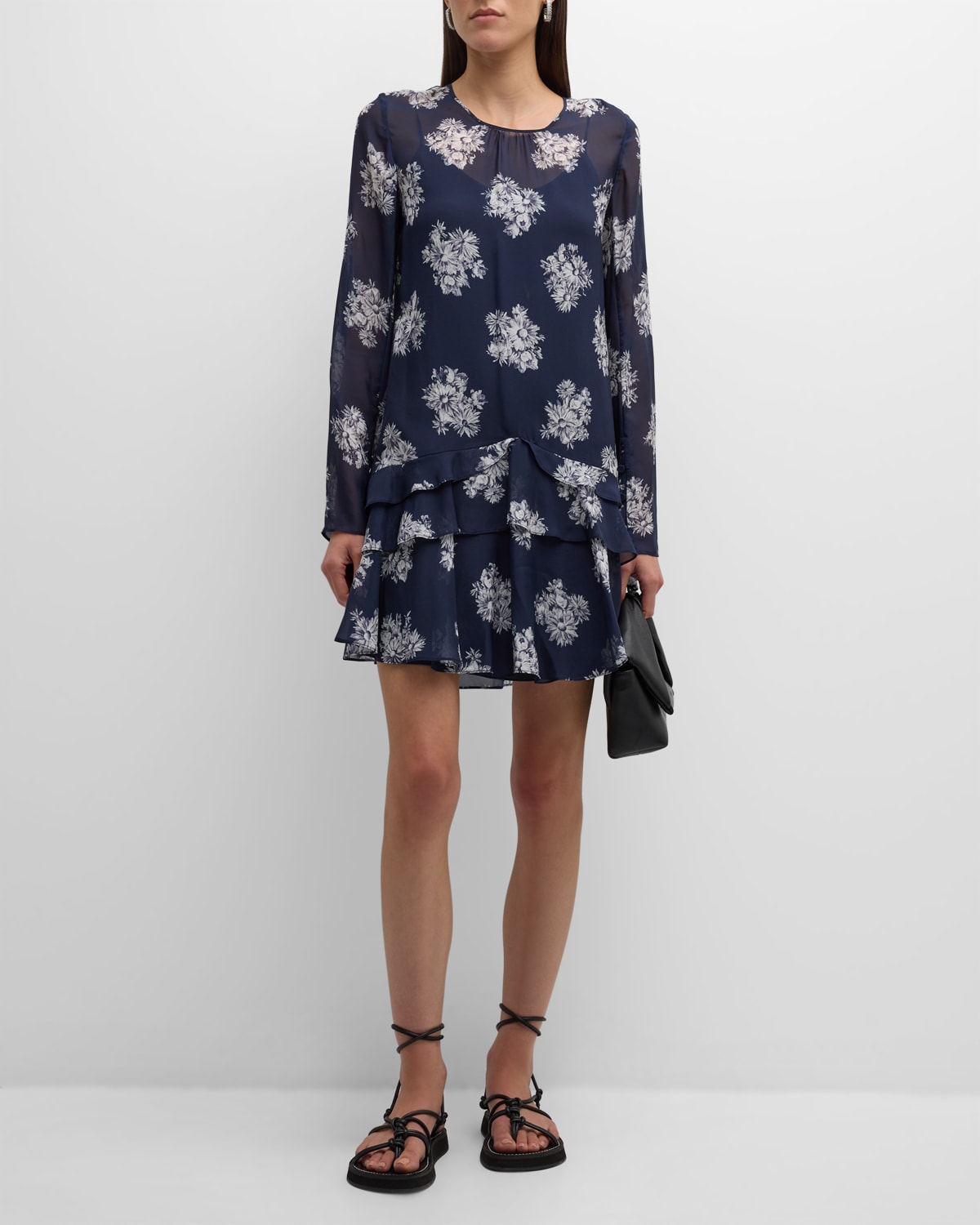 Jason Wu floral-print mini dress with layered ruffles Approx. 35″L from shoulders to hem Scoop neckline Long sleeves; approx. 32″L Hem falls above the knee Shift silhouette Invisible back zipper Silk Dry clean Imported