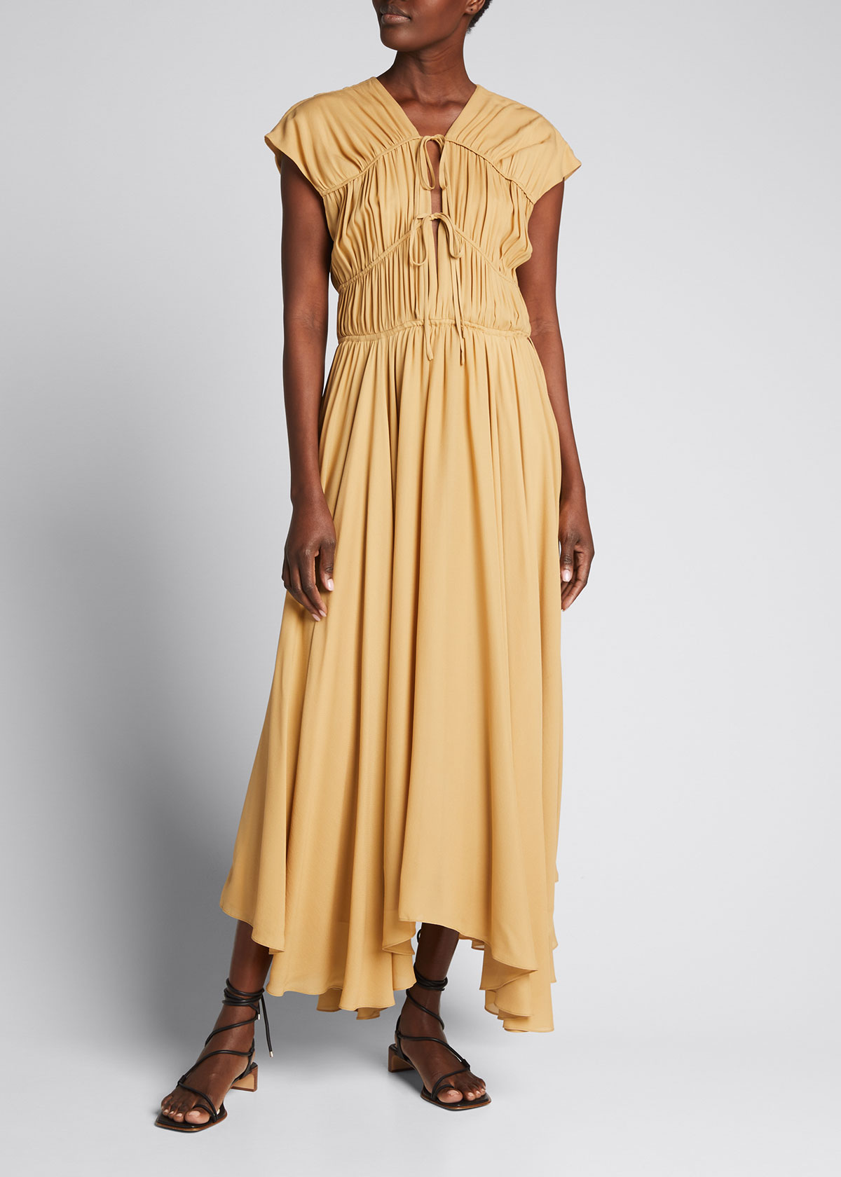 Tove “Flores” ruched dress in silk double georgette. V neckline. Cap sleeves. Gathering through bodice. Delicate front ties. A-line silhouette. Hem falls below the knee. Asymmetrical hem. Pullover style. Silk. Imported.