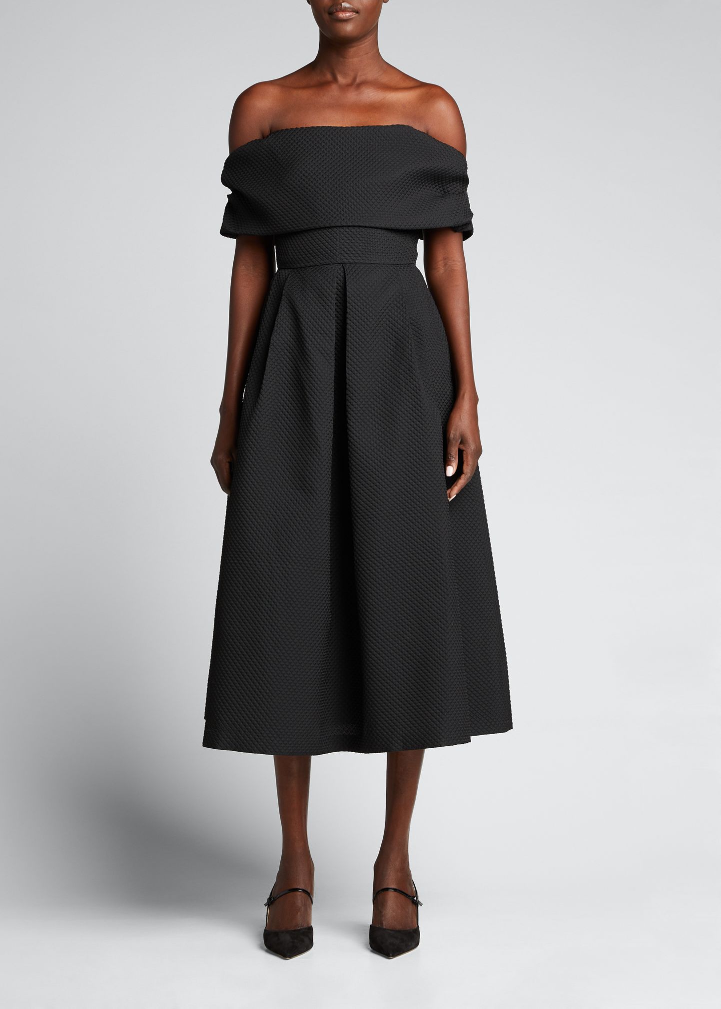 Lela Rose textured dress with full skirt Folded off-the-shoulder neckline Sleeveless Side slip pockets A-line silhouette Midi length Back zip Polyamide/silk/polyester Polyester lining Dry clean Made in USA from imported materials