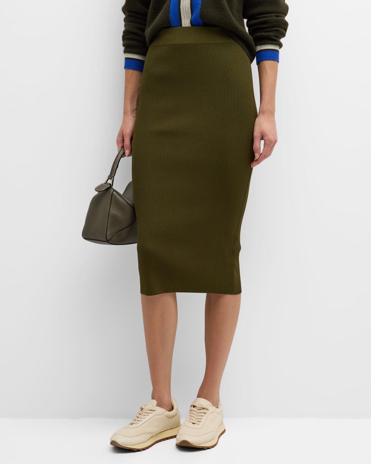 Grey/Ven “Gale” ribbed midi skirt STANDARD 100 by OEKO-TEX® – This item has been laboratory tested to meet 100 control parameters and is free of harmful substances Sits high on the hips Hem falls below the knee Pencil silhouette Pull-on style Rayon/cellulose acetate/polyester/spandex Hand wash or dry clean Imported
