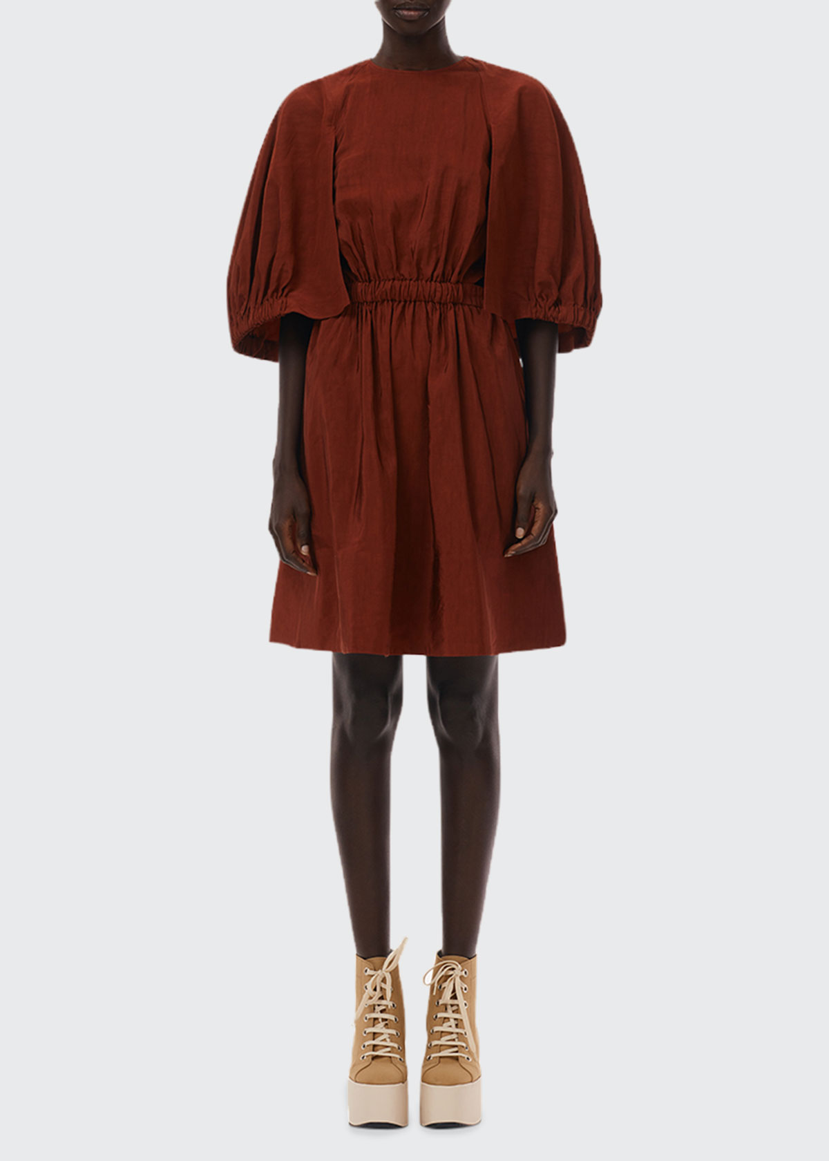 Tibi “Gemma” dress with sculpted sleeves. Approx. length: 38.5″L from shoulder to hem; 38.5″L down center back. Crew neckline; button keyhole back. Elbow sleeves. Cinched waist. Fit-and-flare silhouette. Hem hits above the knee. Slipover style. Viscose/linen. Imported.