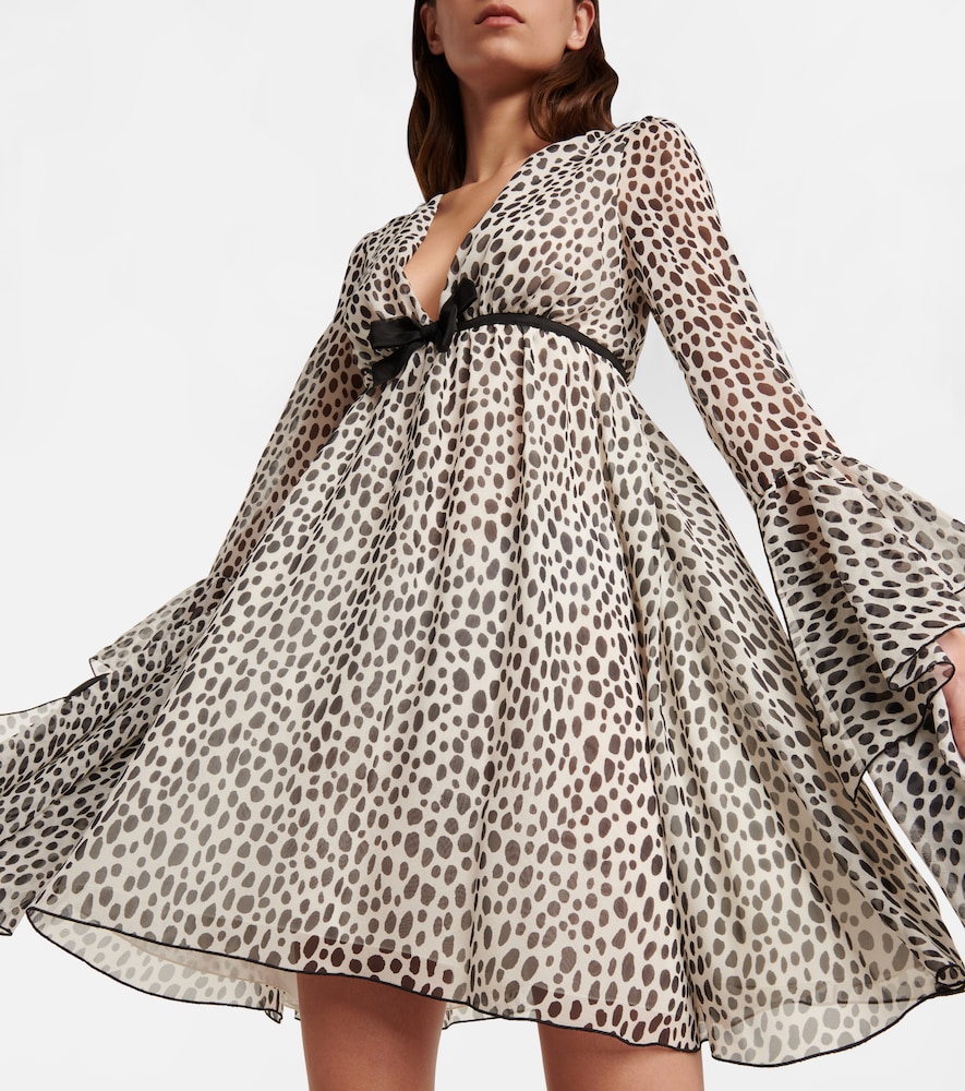 Giambattista Valli’s minidress is made from airy silk georgette in a black and white leopard print. It has a plunge neck, a pretty ribbon waist and fluted sleeves.