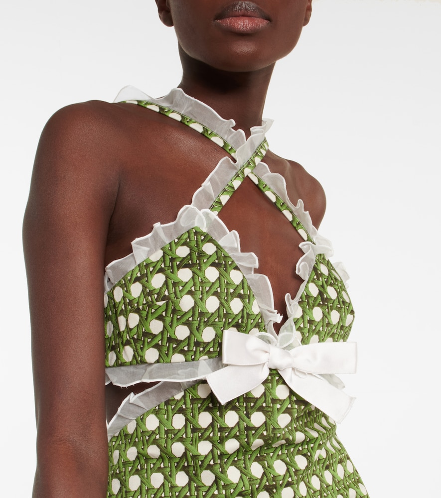 This minidress from Giambattista Valli is made from gabardine with a Treillage print and belongs to the En Plein Air collection. It features romantic ruffled trims, cutouts, and a bow-detail as well as a cross-strap neckline.