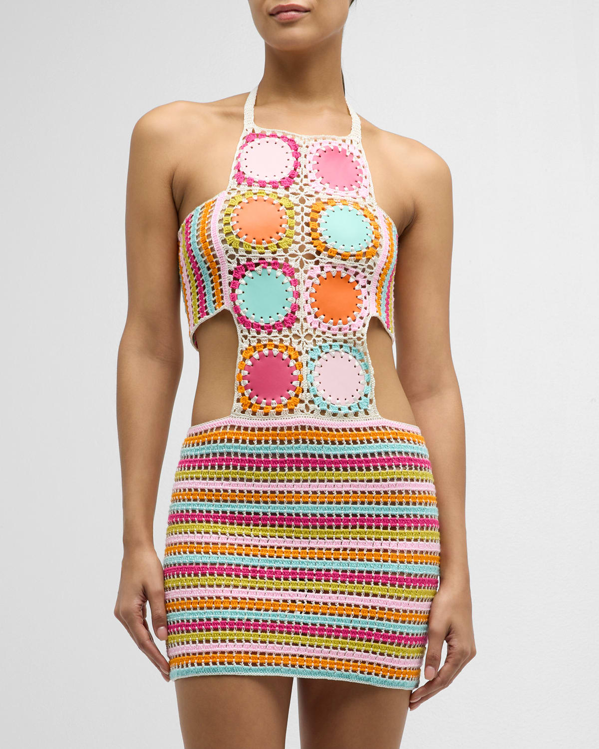 My Beachy Side hand-crochet dress with faux leather scoop motifs Approx. 29.1″L from shoulder to hem Halter neckline; self-ties behind the neck Sleeveless Hem falls above the knee Bodycon fit Lace-up back with tassel ends Microfiber acrylic/polyvinyl chloride/polyester/polyurethane Dry clean Imported