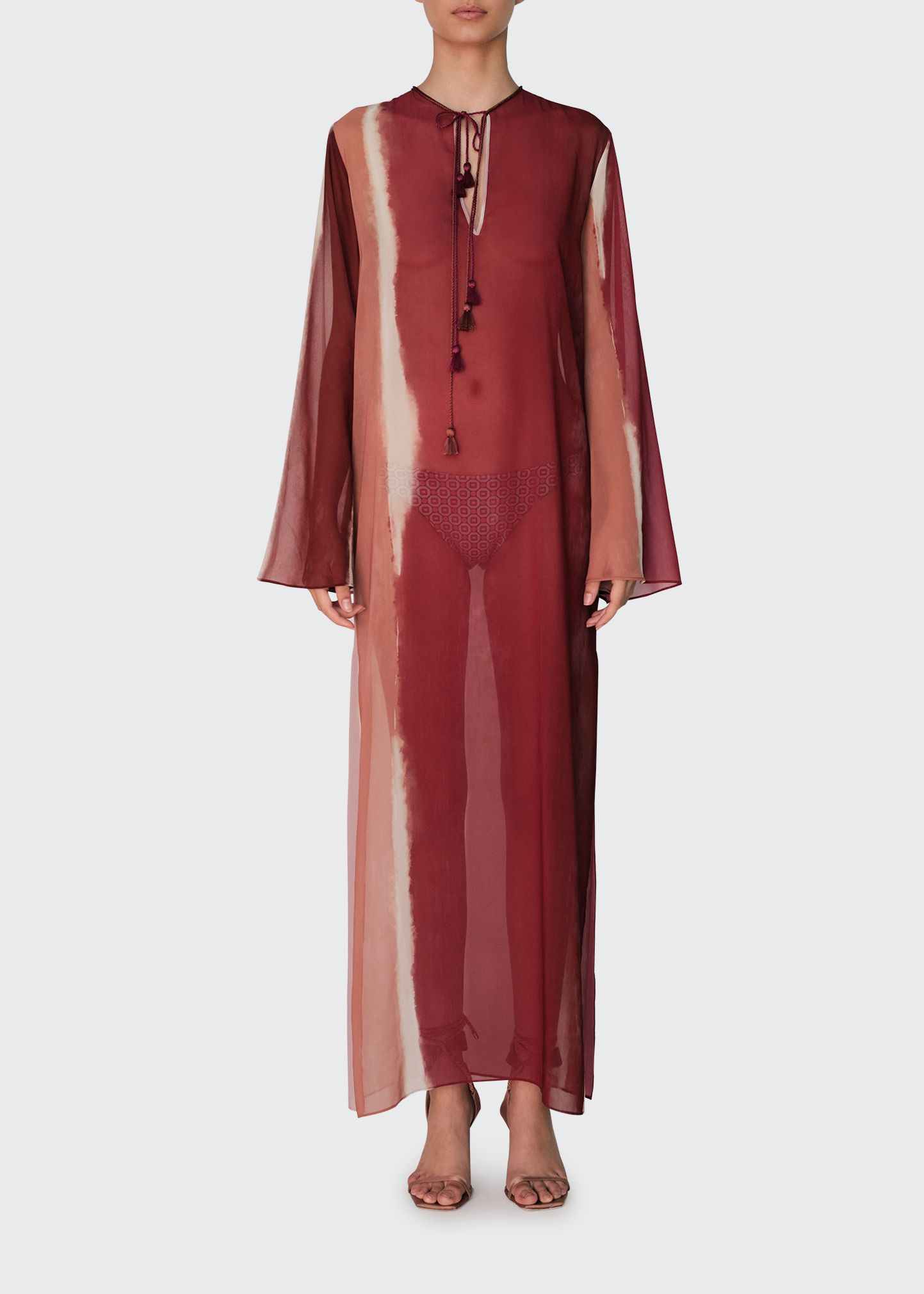 Silvia Tcherassi “Helvetica” chiffon tunic in gradient print Split neckline with tasseled keyhole Long bell sleeves Loose silhouette Maxi length Slipover style Polyester Made in Colombia
