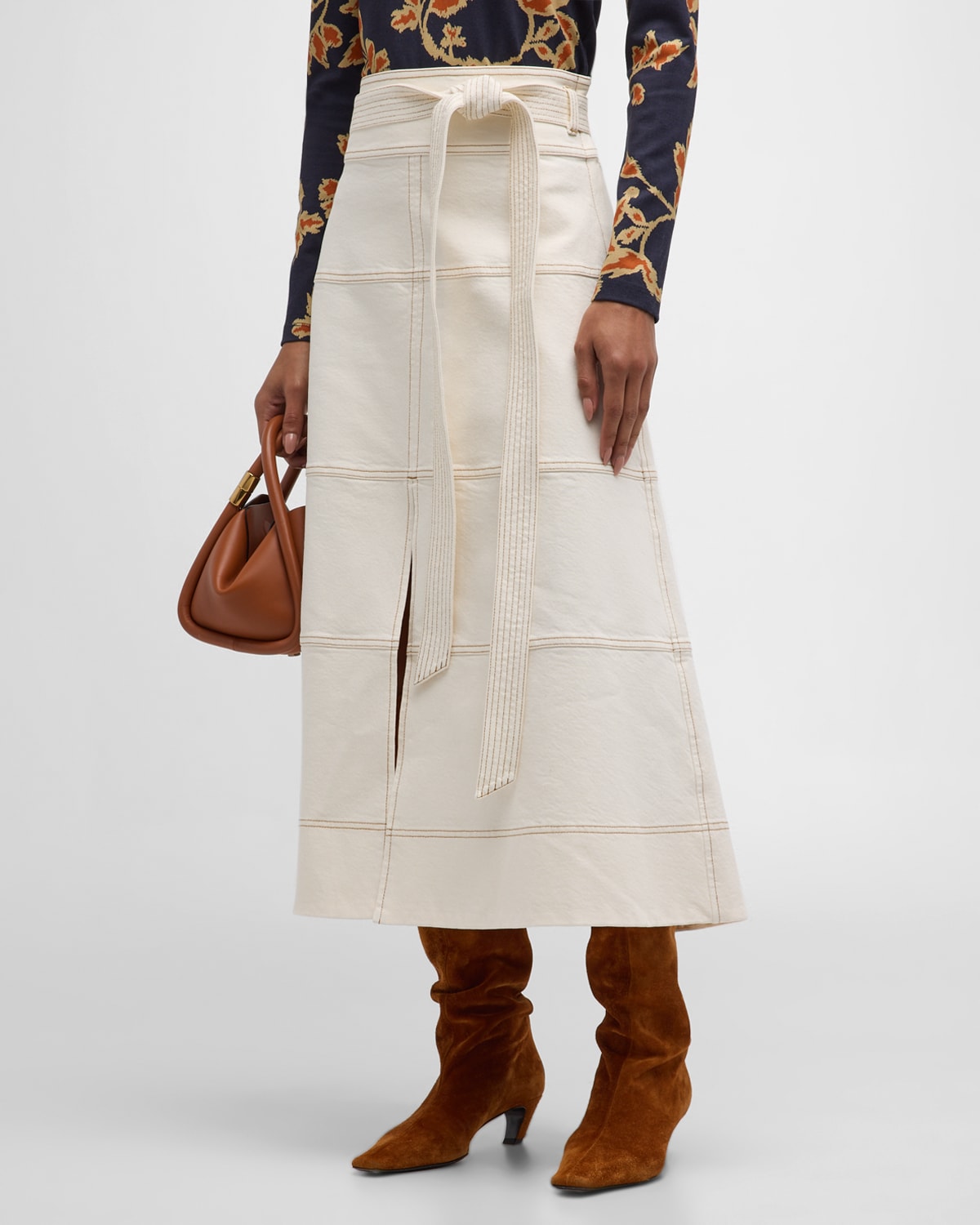 Tanya Taylor “Hudson” denim skirt features tiered contrast seaming High waist Removable tie belt Center-front slit A-line silhouette Midi length Hidden side zipper Cotton/elastane Machine wash warm Imported