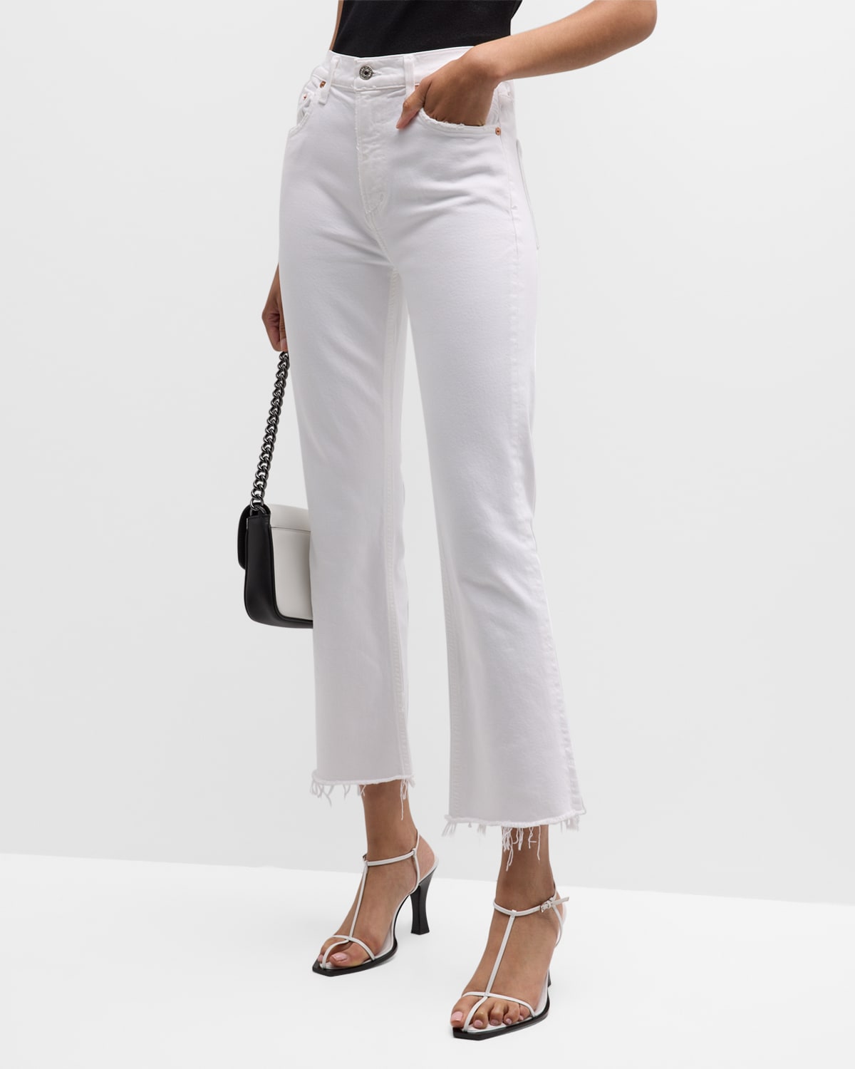 Citizens of Humanity “Isola” bootcut jeans featuring a frayed hem in white denim Five-pocket style High rise Fitted through hip; flared from knee Cropped length Button/zip fly; belt loops Organic cotton/viscose/elastane Made in USA