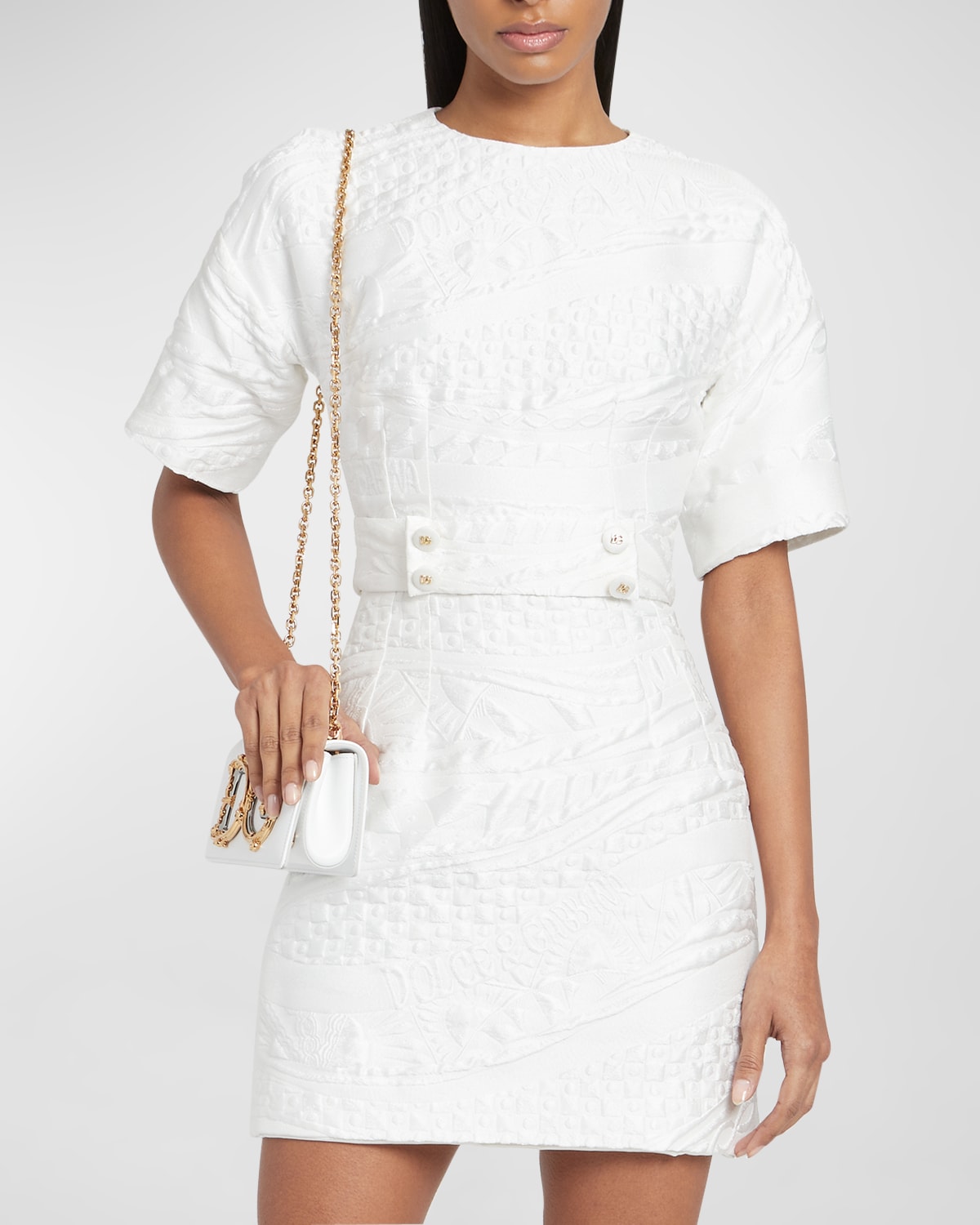 Dolce & Gabbana jacquard brocade dress featuring DG button-tab front detail Round neckline Short sleeves Sheath silhouette Mini length Concealed back zip Polyester/nylon/silk Made in Italy