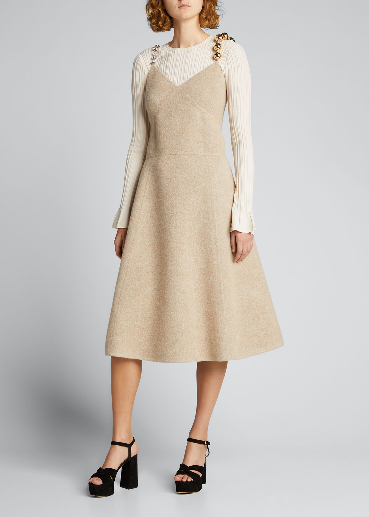 MERYLL ROGGE double-face dress with jewel-embellished straps. V neckline. Sleeveless. A-line silhouette. Hem falls below the hem. Back zip. Baby llama/nylon/virgin wool. Silk, lining. Dry clean. Made in Italy.