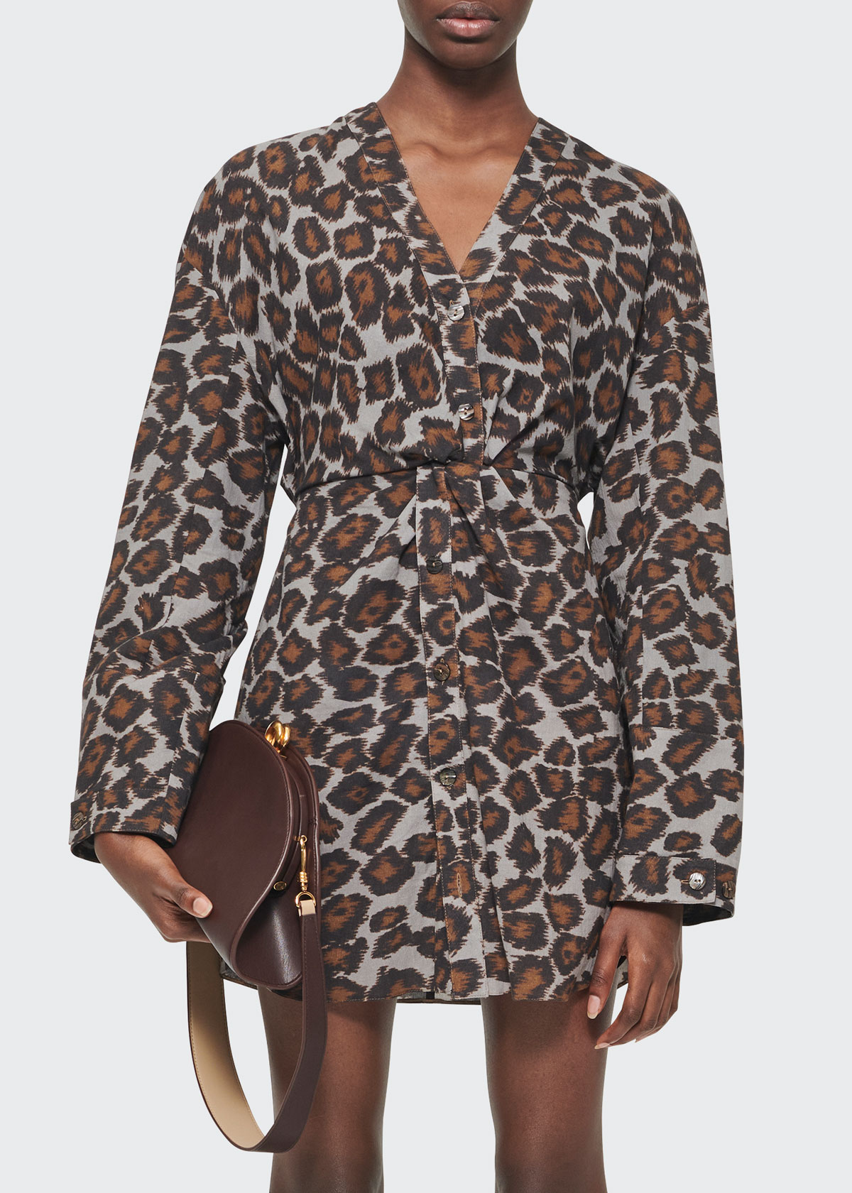 Nanushka “Johanna” ocelot-print dress. V neckline; button front. Long sleeves; button cuffs. Twisted waist detail. Hem hits above the knee. Cotton. Made in Hungary.