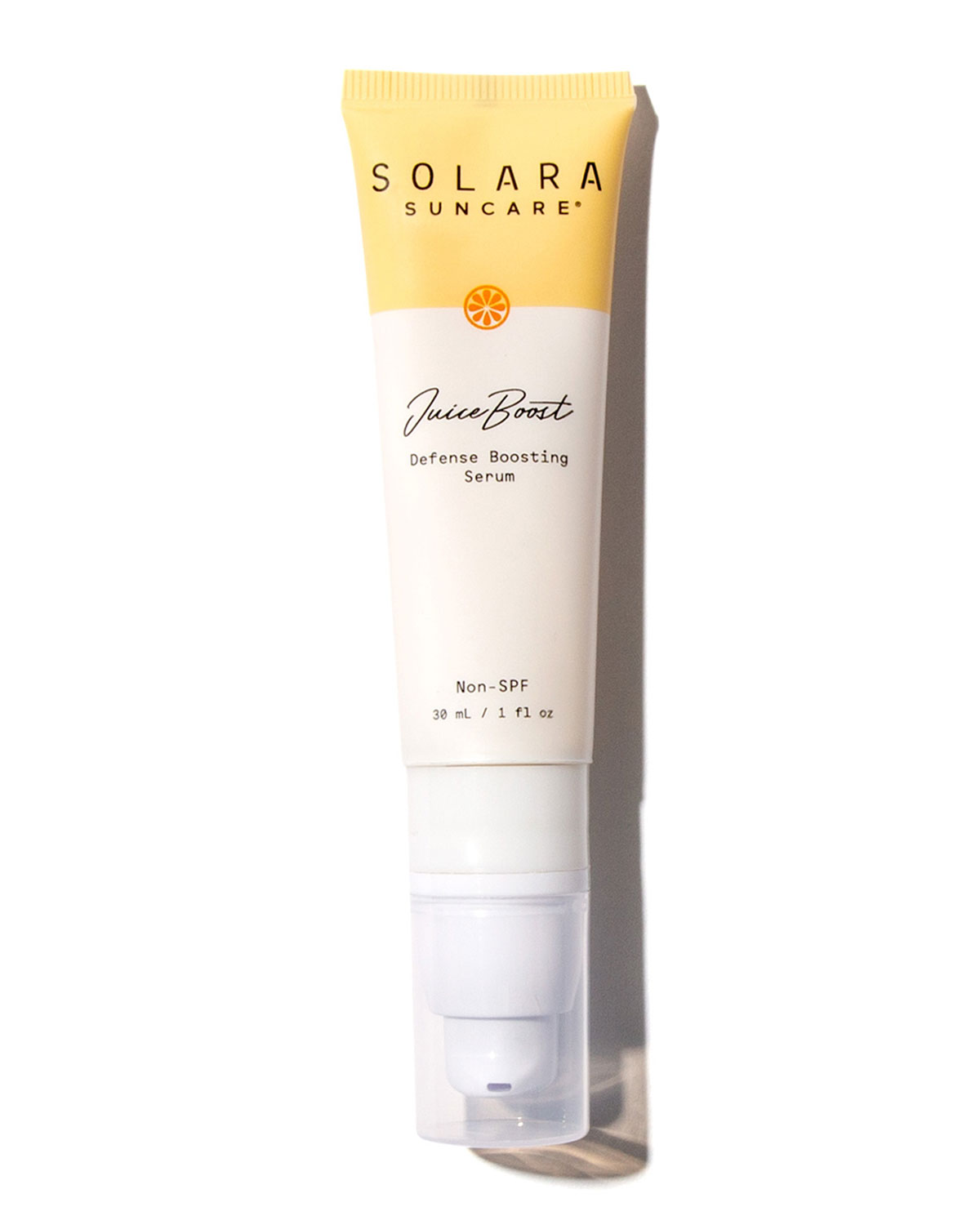 Solara Suncare JuiceBoost Defense Boosting Serum, 1 oz. / 30 mL DetailsJuiceBoost your suncare routine with this non-SPF hydrating cocktail of powerful, bioavailable and antioxidant rich actives that instantly reinvigorate thirsty skin. Solara Defense Boosting Serums complement their sunscreens for amped-up skincare level results no matter your skin type or season. Quench + Nourish Watermelon, Prickly Pear, Aloe and Monoi de Tahiti infuse a skin-loving and hydrating defense boost. Brighten + .